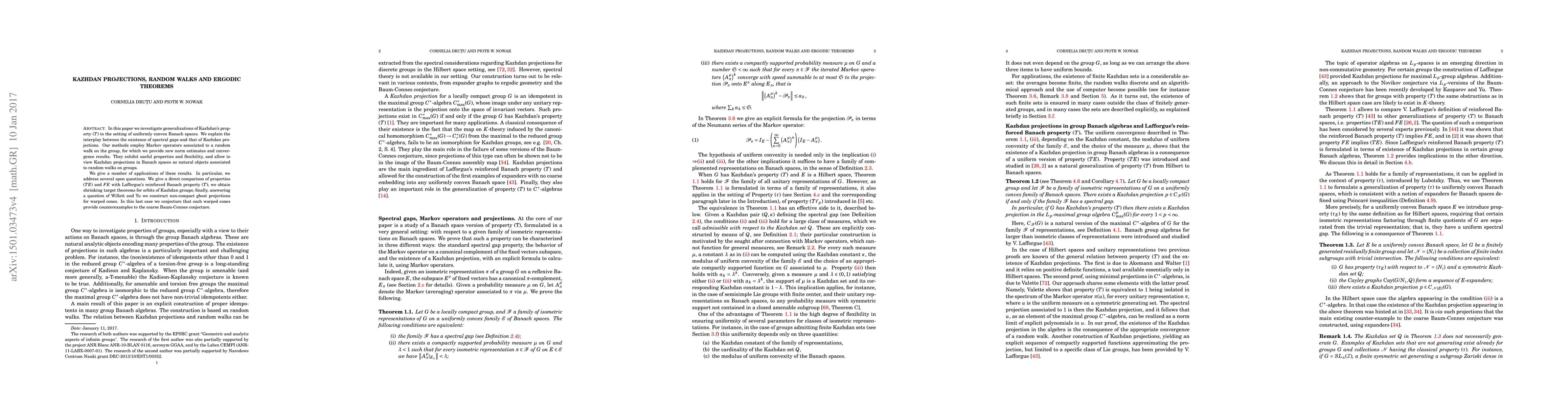 This paper generalizes Kazhdan's property $(T)$ to uniformly convex Banach spaces, linking spectral gaps and Kazhdan projections via Markov operators from random walks on groups, and applies these results to address several open questions including ghost projections for warped cones.