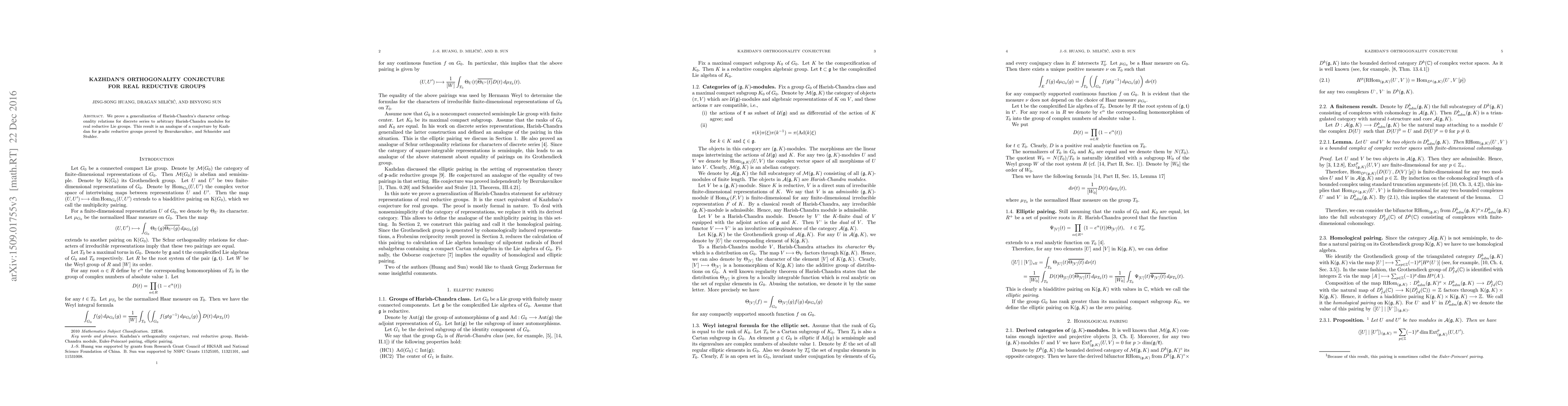This paper proves a generalization of Harish-Chandra's orthogonality relations for discrete series to all Harish-Chandra modules for real reductive groups, establishing an analogue of Kazhdan's conjecture previously proven for $\mathfrak p$-adic groups.