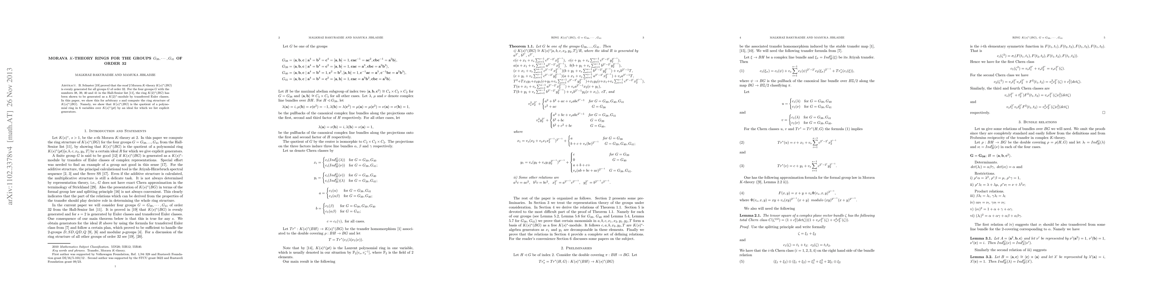 B. Schuster \cite{SCH1} proved that the $mod$ 2 Morava $K$-theory $K(s)^*(BG)$ is evenly generated for all groups $G$ of order 32. For the four groups $G$ with the numbers 38, 39, 40 and 41 in the Hall-Senior list \cite{H}, the ring $K(2)^*(BG)$ has been shown to be generated as a $K(2)^*$-module by transferred Euler classes. In this paper, we show this for arbitrary $s$ and compute the ring structure of $K(s)^*(BG)$. Namely, we show that $K(s)^*(BG)$ is the quotient of a polynomial ring in 6 variables over $K(s)^*(pt)$ by an ideal for which we list explicit generators.