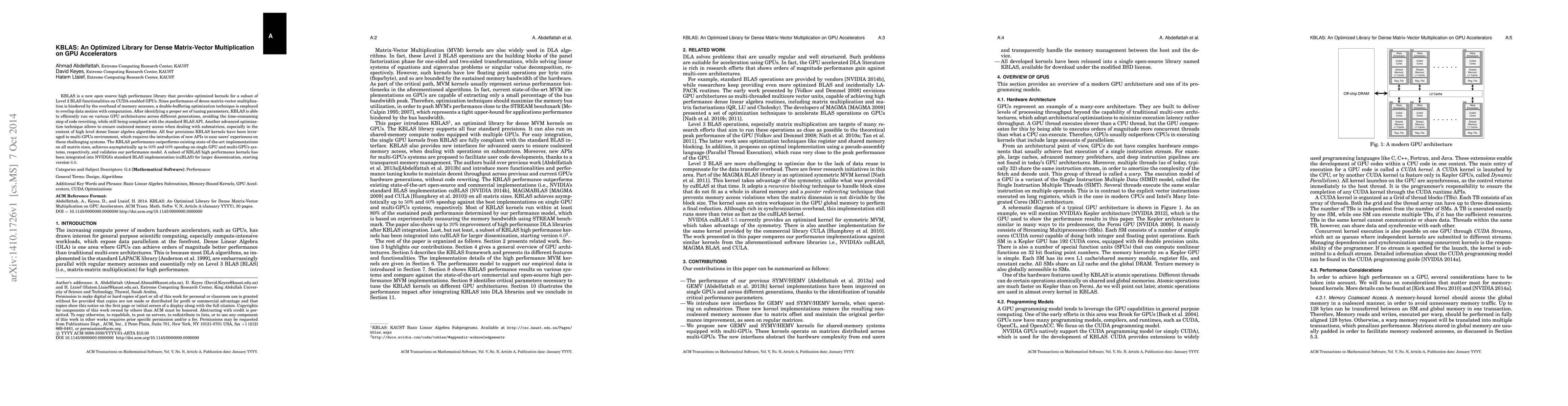 KBLAS provides an optimized library for dense matrix-vector multiplication on GPUs, significantly improving performance for various applications in scientific computing, machine learning, and data analytics. Its compatibility with the standard BLAS API ensures ease of integration into existing software.