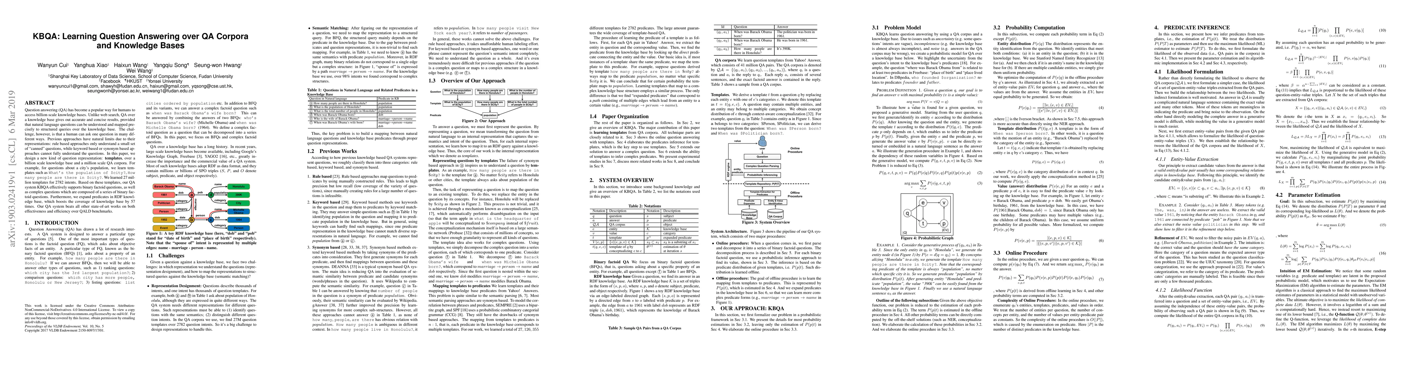 This paper introduces KBQA, a novel question answering system that leverages learned templates from QA corpora and knowledge bases to handle a wide variety of natural language questions. KBQA significantly outperforms existing methods by expanding knowledge base predicates and supporting both simple and complex questions, achieving top results on QALD benchmarks.