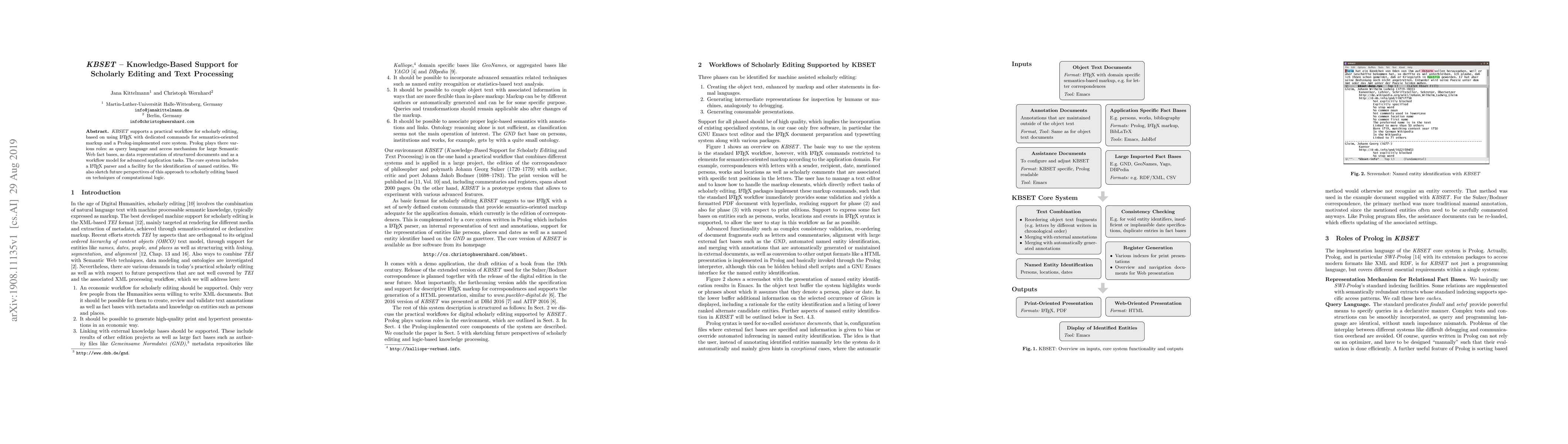 KBSET supports a practical workflow for scholarly editing, based on using LaTeX with dedicated commands for semantics-oriented markup and a Prolog-implemented core system. Prolog plays there various roles: as query language and access mechanism for large Semantic Web fact bases, as data representation of structured documents and as a workflow model for advanced application tasks. The core system includes a LaTeX parser and a facility for the identification of named entities. We also sketch future perspectives of this approach to scholarly editing based on techniques of computational logic.