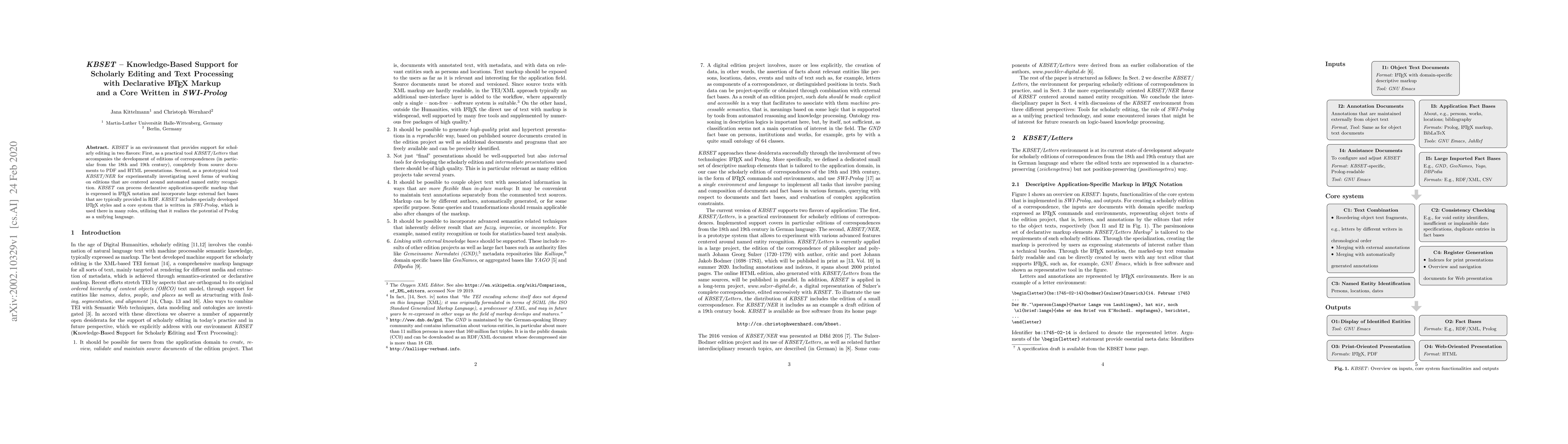 A research paper introduces KBSET, an environment that supports scholarly editing with declarative LaTeX markup and a core written in SWI-Prolog. It provides two tools: one for practical editing and another for investigating novel forms of automated named entity recognition.