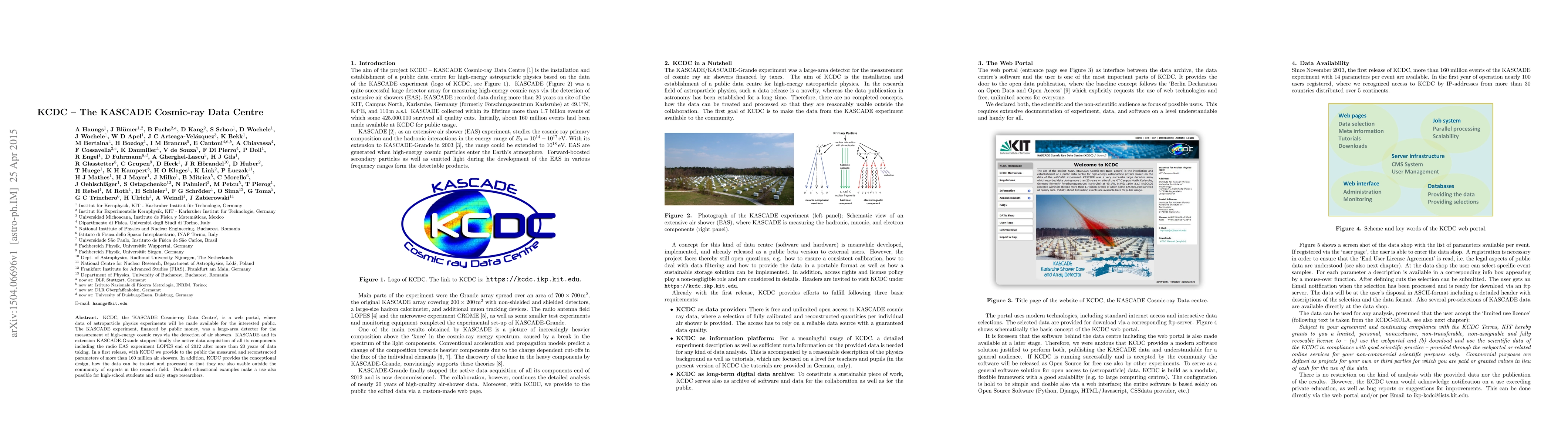 KCDC, the KASCADE Cosmic-ray Data Centre, is a web portal, where data of astroparticle physics experiments will be made available for the interested public. The KASCADE experiment, financed by public money, was a large-area detector for the measurement of high-energy cosmic rays via the detection of air showers. KASCADE and its extension KASCADE-Grande stopped finally the active data acquisition of all its components including the radio EAS experiment LOPES end of 2012 after more than 20 years of data taking. In a first release, with KCDC we provide to the public the measured and reconstructed parameters of more than 160 million air showers. In addition, KCDC provides the conceptional design, how the data can be treated and processed so that they are also usable outside the community of experts in the research field. Detailed educational examples make a use also possible for high-school students and early stage researchers.