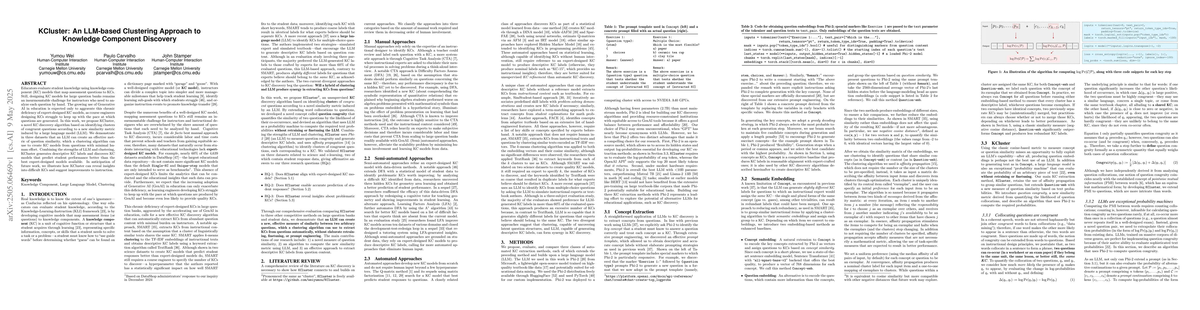 KCluster introduces a novel approach that combines large language models and clustering algorithms for automated KC discovery, outperforming existing expert-designed models.