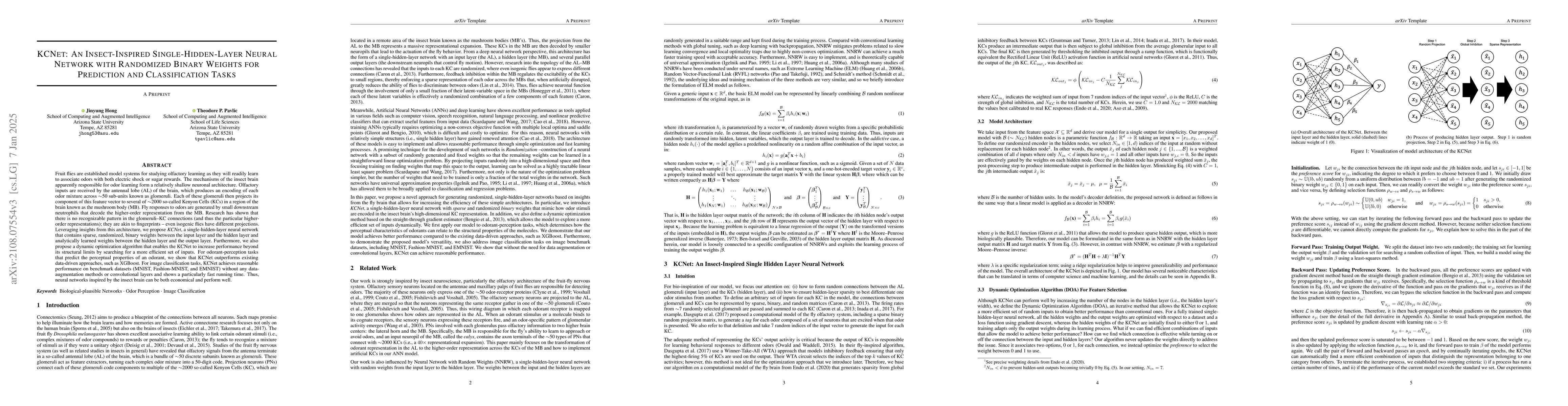 Fruit flies are established model systems for studying olfactory learning as they will readily learn to associate odors with both electric shock or sugar rewards. The mechanisms of the insect brain apparently responsible for odor learning form a relatively shallow neuronal architecture. Olfactory inputs are received by the antennal lobe (AL) of the brain, which produces an encoding of each odor mixture across ~50 sub-units known as glomeruli. Each of these glomeruli then project its component of this feature vector to several of ~2000 so-called Kenyon Cells (KCs) in a region of the brain known as the mushroom body (MB). Fly responses to odors are generated by small downstream neuropils that decode the higher-order representation from the MB. Research has shown that there is no recognizable pattern in the glomeruli--KC connections (and thus the particular higher-order representations); they are akin to fingerprints~-- even isogenic flies have different projections. Leveraging insights from this architecture, we propose KCNet, a single-hidden-layer neural network that contains sparse, randomized, binary weights between the input layer and the hidden layer and analytically learned weights between the hidden layer and the output layer. Furthermore, we also propose a dynamic optimization algorithm that enables the KCNet to increase performance beyond its structural limits by searching a more efficient set of inputs. For odorant-perception tasks that predict perceptual properties of an odorant, we show that KCNet outperforms existing data-driven approaches, such as XGBoost. For image-classification tasks, KCNet achieves reasonable performance on benchmark datasets (MNIST, Fashion-MNIST, and EMNIST) without any data-augmentation methods or convolutional layers and shows particularly fast running time. Thus, neural networks inspired by the insect brain can be both economical and perform well.