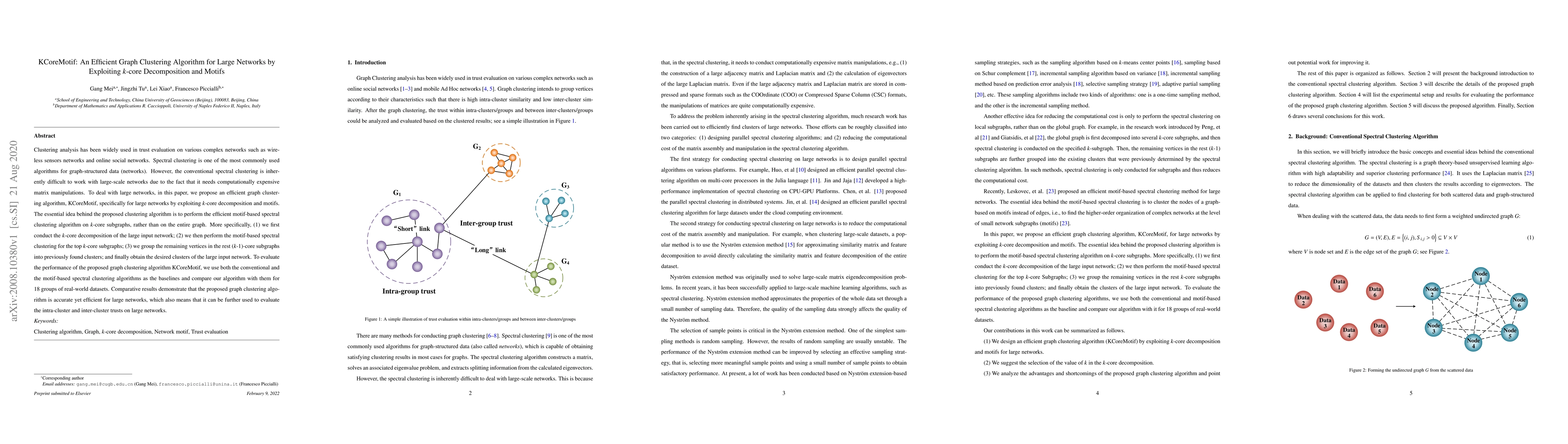 Clustering analysis has been widely used in trust evaluation on various complex networks such as wireless sensors networks and online social networks. Spectral clustering is one of the most commonly used algorithms for graph-structured data (networks). However, the conventional spectral clustering is inherently difficult to work with large-scale networks due to the fact that it needs computationally expensive matrix manipulations. To deal with large networks, in this paper, we propose an efficient graph clustering algorithm, KCoreMotif, specifically for large networks by exploiting k-core decomposition and motifs. The essential idea behind the proposed clustering algorithm is to perform the efficient motif-based spectral clustering algorithm on k-core subgraphs, rather than on the entire graph. More specifically, (1) we first conduct the k-core decomposition of the large input network; (2) we then perform the motif-based spectral clustering for the top k-core subgraphs; (3) we group the remaining vertices in the rest (k-1)-core subgraphs into previously found clusters; and finally obtain the desired clusters of the large input network. To evaluate the performance of the proposed graph clustering algorithm KCoreMotif, we use both the conventional and the motif-based spectral clustering algorithms as the baselines and compare our algorithm with them for 18 groups of real-world datasets. Comparative results demonstrate that the proposed graph clustering algorithm is accurate yet efficient for large networks, which also means that it can be further used to evaluate the intra-cluster and inter-cluster trusts on large networks.