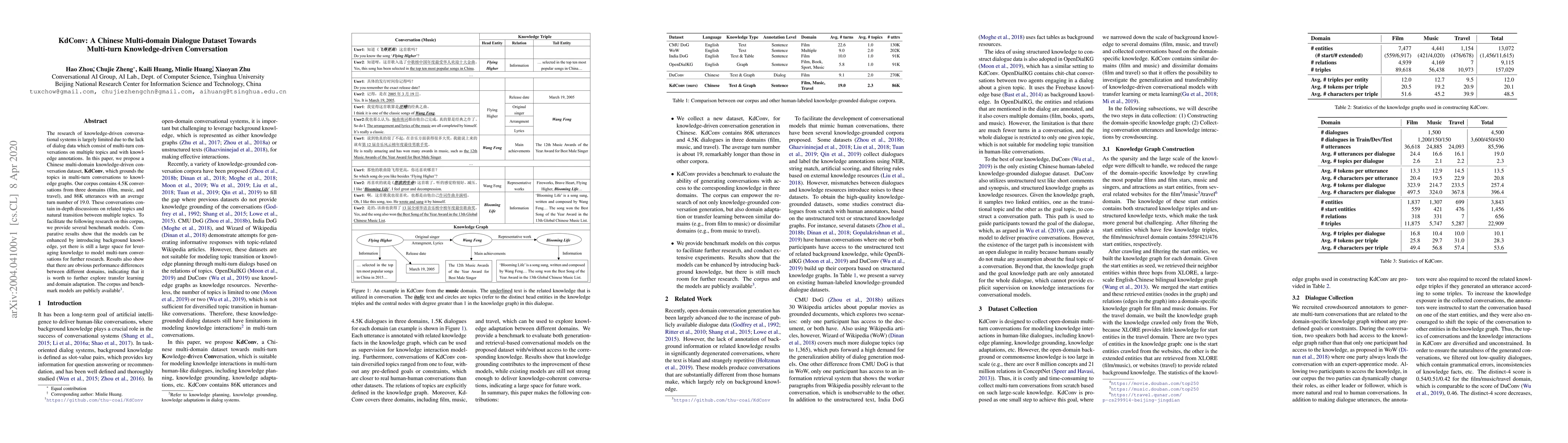 This paper introduces KdConv, a Chinese multi-domain dataset for knowledge-driven conversations, featuring 4.5K multi-turn dialogues across film, music, and travel domains. The dataset aims to enhance research on multi-turn conversations by incorporating knowledge graphs, and it includes benchmark models to facilitate further study.