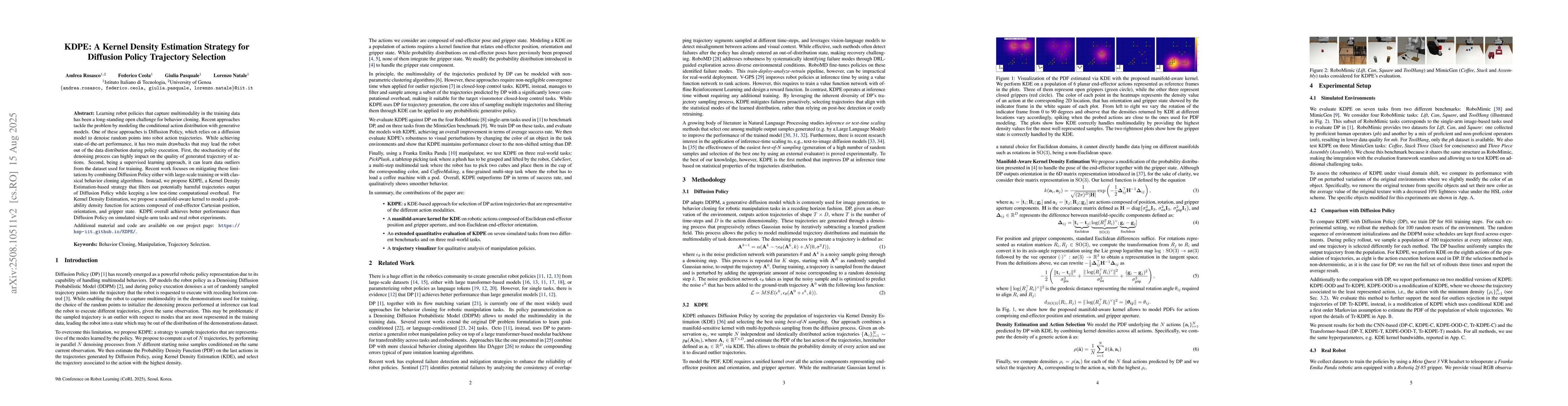 Learning robot policies that capture multimodality in the training data has been a long-standing open challenge for behavior cloning. Recent approaches tackle the problem by modeling the conditional action distribution with generative models. One of these approaches is Diffusion Policy, which relies on a diffusion model to denoise random points into robot action trajectories. While achieving state-of-the-art performance, it has two main drawbacks that may lead the robot out of the data distribution during policy execution. First, the stochasticity of the denoising process can highly impact on the quality of generated trajectory of actions. Second, being a supervised learning approach, it can learn data outliers from the dataset used for training. Recent work focuses on mitigating these limitations by combining Diffusion Policy either with large-scale training or with classical behavior cloning algorithms. Instead, we propose KDPE, a Kernel Density Estimation-based strategy that filters out potentially harmful trajectories output of Diffusion Policy while keeping a low test-time computational overhead. For Kernel Density Estimation, we propose a manifold-aware kernel to model a probability density function for actions composed of end-effector Cartesian position, orientation, and gripper state. KDPE overall achieves better performance than Diffusion Policy on simulated single-arm tasks and real robot experiments. Additional material and code are available on our project page at https://hsp-iit.github.io/KDPE/.