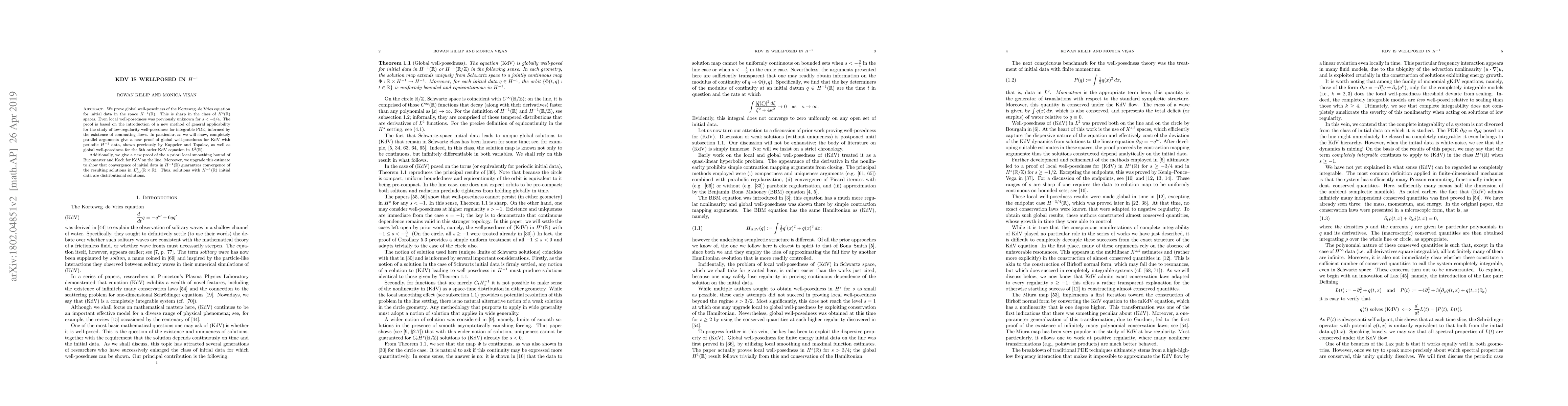We prove global well-posedness of the Korteweg--de Vries equation for initial data in the space $H^{-1}(R)$. This is sharp in the class of $H^{s}(R)$ spaces. Even local well-posedness was previously unknown for $s<-3/4$. The proof is based on the introduction of a new method of general applicability for the study of low-regularity well-posedness for integrable PDE, informed by the existence of commuting flows. In particular, as we will show, completely parallel arguments give a new proof of global well-posedness for KdV with periodic $H^{-1}$ data, shown previously by Kappeler and Topalov, as well as global well-posedness for the 5th order KdV equation in $L^2(R)$. Additionally, we give a new proof of the a priori local smoothing bound of Buckmaster and Koch for KdV on the line. Moreover, we upgrade this estimate to show that convergence of initial data in $H^{-1}(R)$ guarantees convergence of the resulting solutions in $L^2_\text{loc}(R\times R)$. Thus, solutions with $H^{-1}(R)$ initial data are distributional solutions.