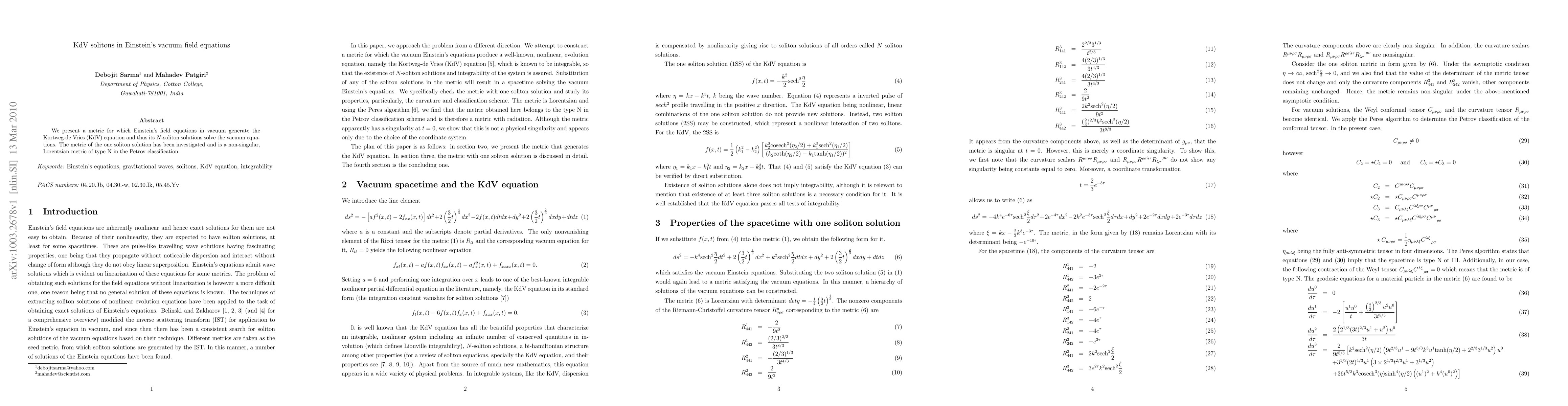 This paper proposes a metric where Einstein's vacuum field equations yield the KdV equation, demonstrating that its $N$-soliton solutions satisfy the vacuum equations. The one soliton solution is shown to be a non-singular, Lorentzian metric of type N in the Petrov classification.