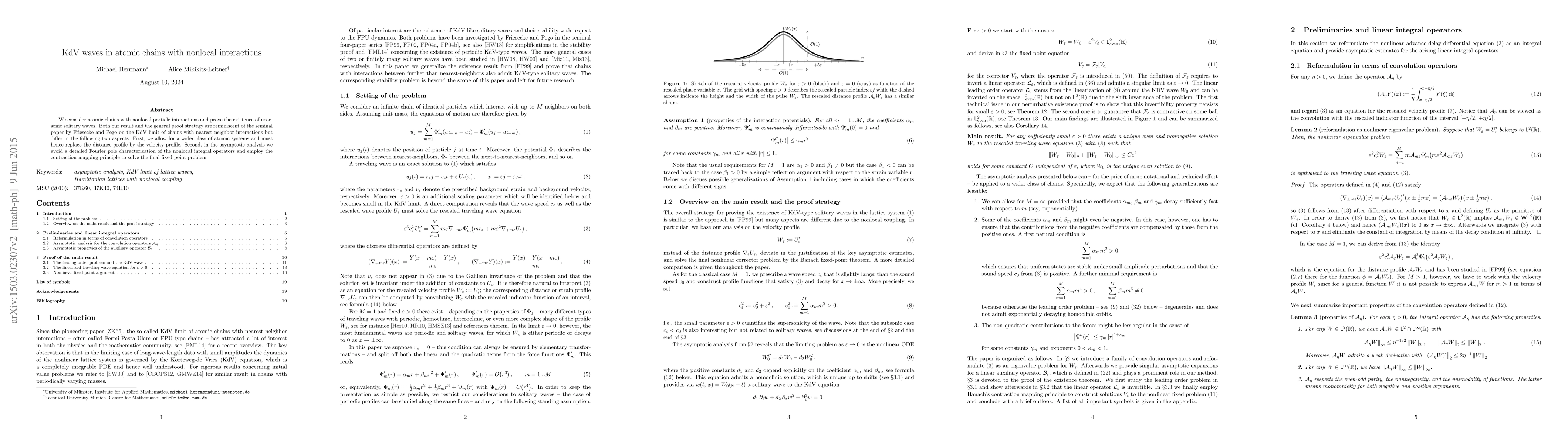 We consider atomic chains with nonlocal particle interactions and prove the existence of near-sonic solitary waves. Both our result and the general proof strategy are reminiscent of the seminal paper by Friesecke and Pego on the KdV limit of chains with nearest neighbor interactions but differ in the following two aspects: First, we allow for a wider class of atomic systems and must hence replace the distance profile by the velocity profile. Second, in the asymptotic analysis we avoid a detailed Fourier pole characterization of the nonlocal integral operators and employ the contraction mapping principle to solve the final fixed point problem.
