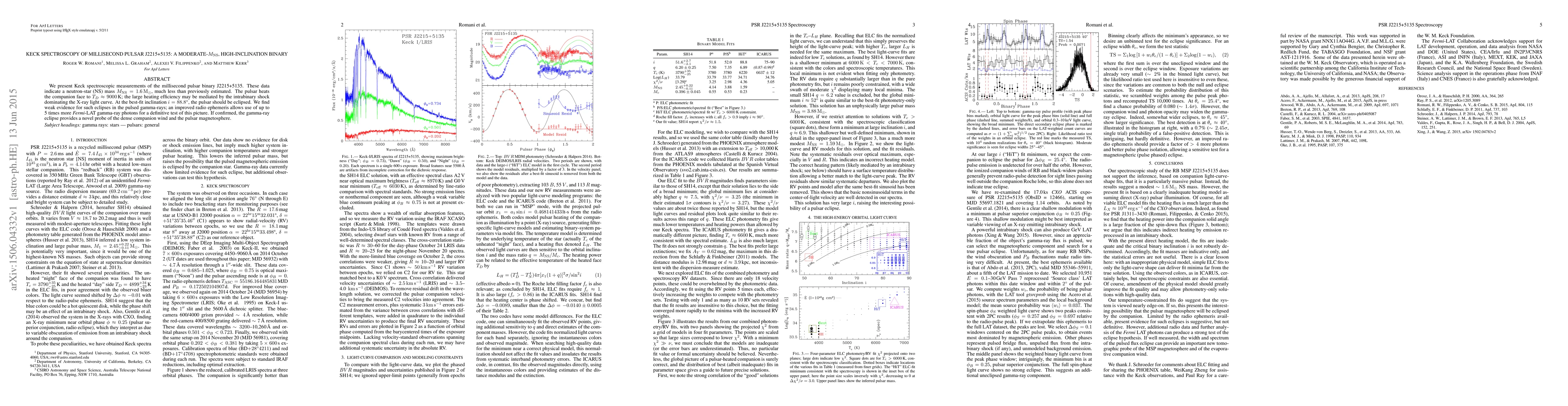 This paper reports Keck spectroscopic measurements of the millisecond pulsar binary J2215+5135, revealing a neutron-star mass of 1.6 solar masses, significantly lower than earlier estimates. The pulsar heats the companion star to 9000K, suggesting an intrabinary shock's role in the X-ray light curve.
