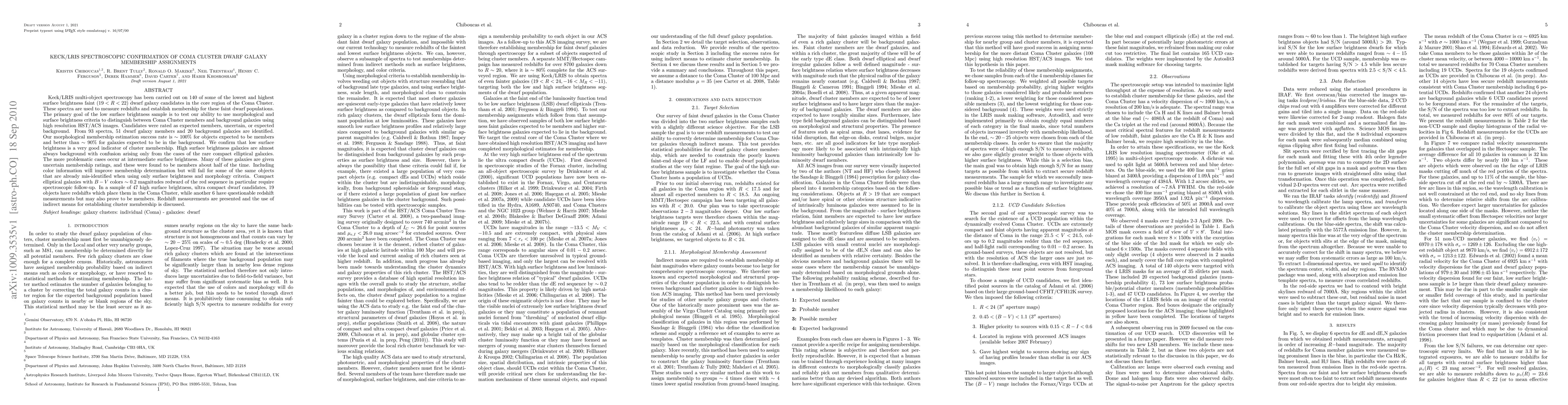The Keck/LRIS spectroscopic study confirms the membership of 51 out of 140 faint dwarf galaxy candidates in the Coma Cluster, using redshift measurements. The study finds that low surface brightness is a strong indicator of cluster membership, while high surface brightness galaxies are mostly background objects, with intermediate brightness cases requiring further analysis.