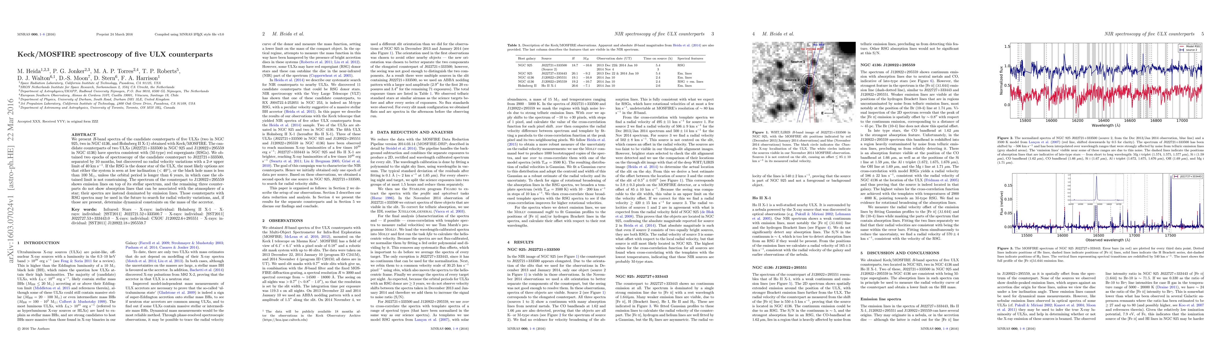 We present H-band spectra of the candidate counterparts of five ULXs (two in NGC 925, two in NGC 4136, and Holmberg II X-1) obtained with Keck/MOSFIRE. The candidate counterparts of two ULXs (J022721+333500 in NGC 925 and J120922+295559 in NGC 4136) have spectra consistent with (M-type) red supergiants (RSGs). We obtained two epochs of spectroscopy of the candidate counterpart to J022721+333500, separated by 10 months, but discovered no radial velocity variations with a 2-$\sigma$ upper limit of 40 km/s. If the RSG is the donor star of the ULX, the most likely options are that either the system is seen at low inclination (< 40$^\circ$), or the black hole mass is less than 100 M$_\odot$, unless the orbital period is longer than 6 years, in which case the obtained limit is not constraining. The spectrum of the counterpart to J120922+295559 shows emission lines on top of its stellar spectrum, and the remaining three counterparts do not show absorption lines that can be associated with the atmosphere of a star; their spectra are instead dominated by emission lines. Those counterparts with RSG spectra may be used in the future to search for radial velocity variations, and, if those are present, determine dynamical constraints on the mass of the accretor.
