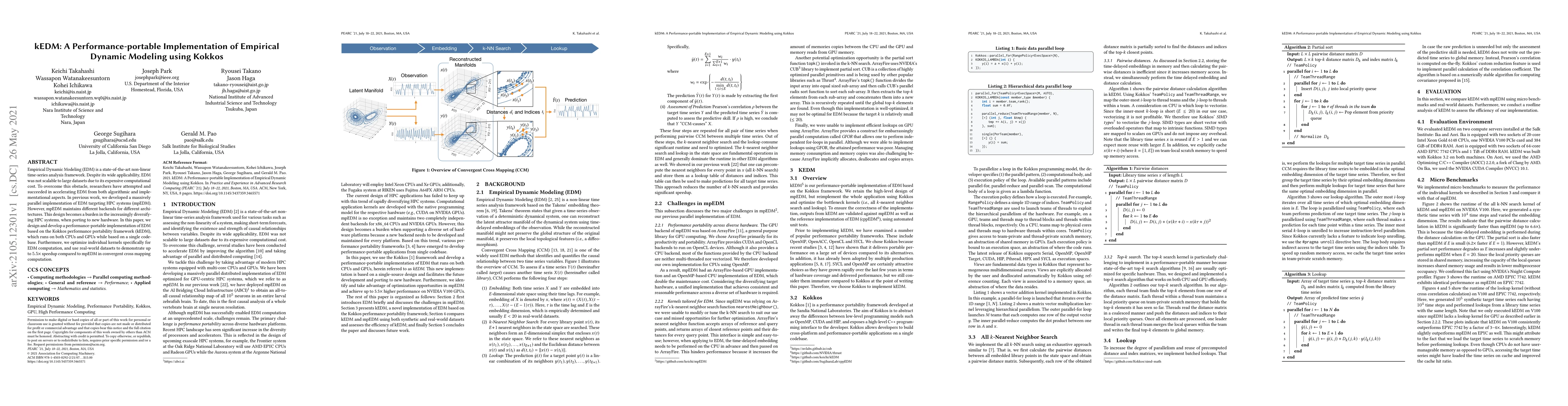 This paper presents kEDM, a performance-portable implementation of Empirical Dynamic Modeling (EDM) using the Kokkos framework, enabling it to run on both CPUs and GPUs with a single codebase, achieving up to 5.5x speedup over previous parallel implementations.