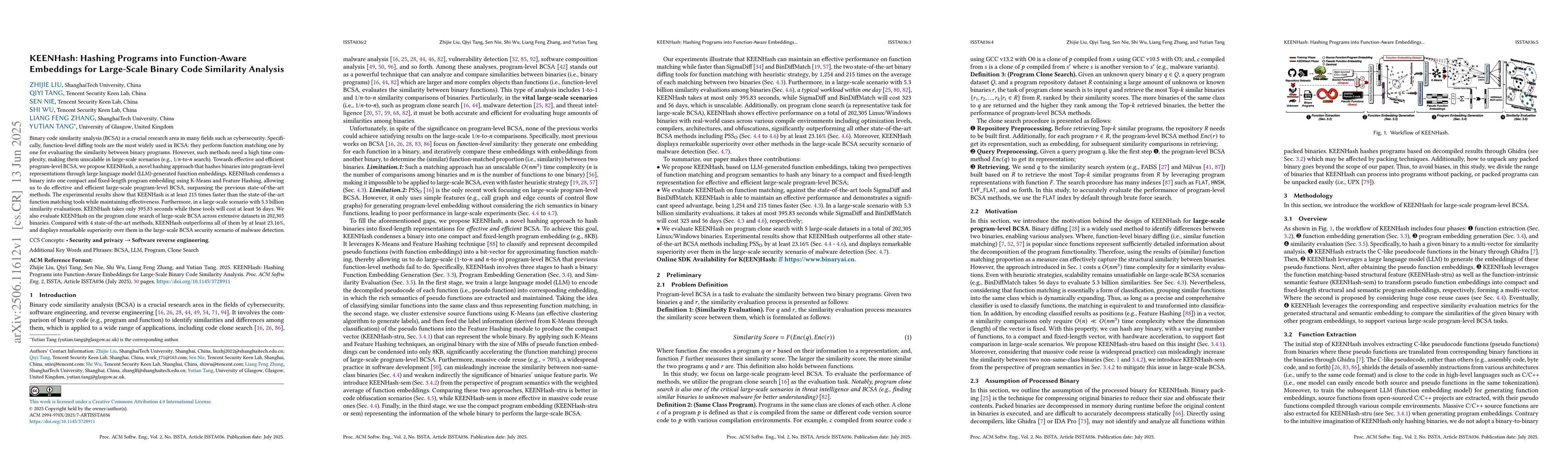 KEENHash proposes a novel large-scale program-level BCSA hashing approach that captures similarities among binaries from dual perspectives of function matching based on K-Means and feature hashing, and program semantics by integrating function embeddings.