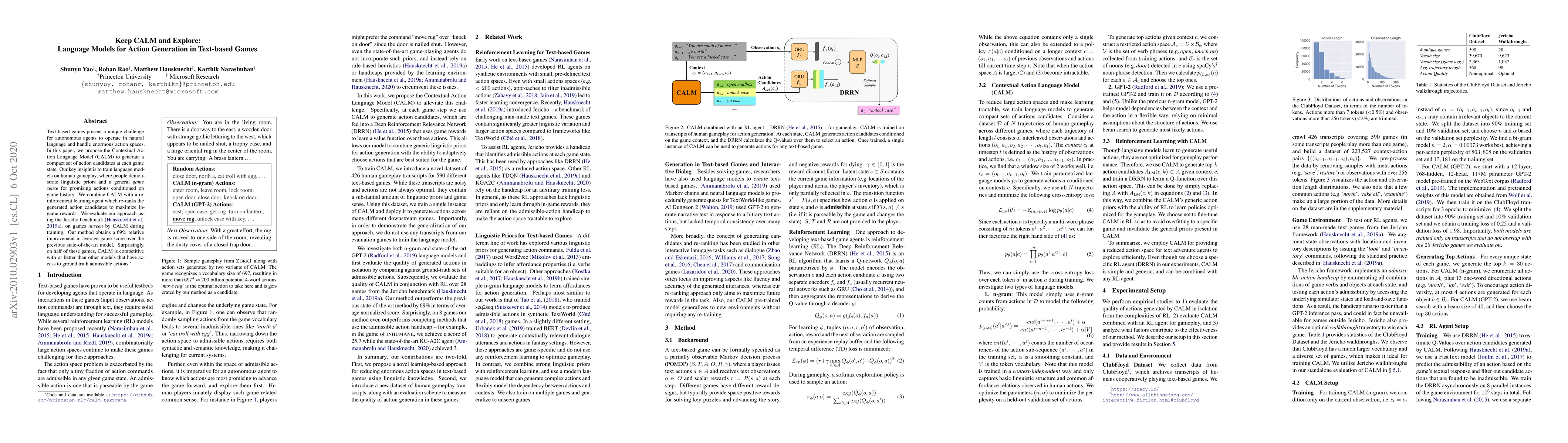 This paper introduces the Contextual Action Language Model (CALM) to generate action candidates for text-based game agents, trained on human gameplay data to capture linguistic and strategic insights. Combined with reinforcement learning, CALM achieves a 69% relative improvement in game scores compared to previous models, often outperforming those with access to ground truth actions.