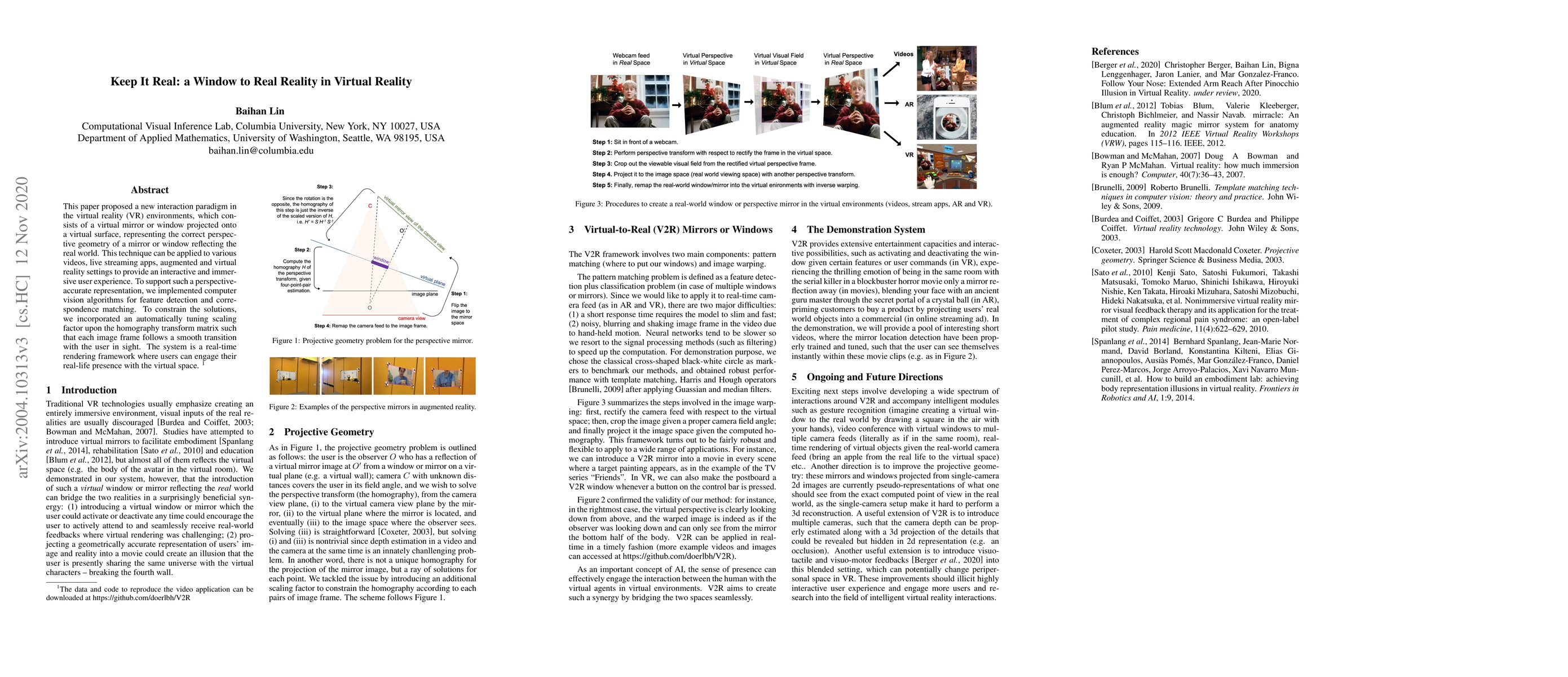 This paper introduces a new VR interaction paradigm featuring a virtual mirror or window that accurately reflects real-world perspectives, implemented using computer vision for feature detection and homography transforms, enabling smooth transitions and real-time rendering for immersive user experiences.