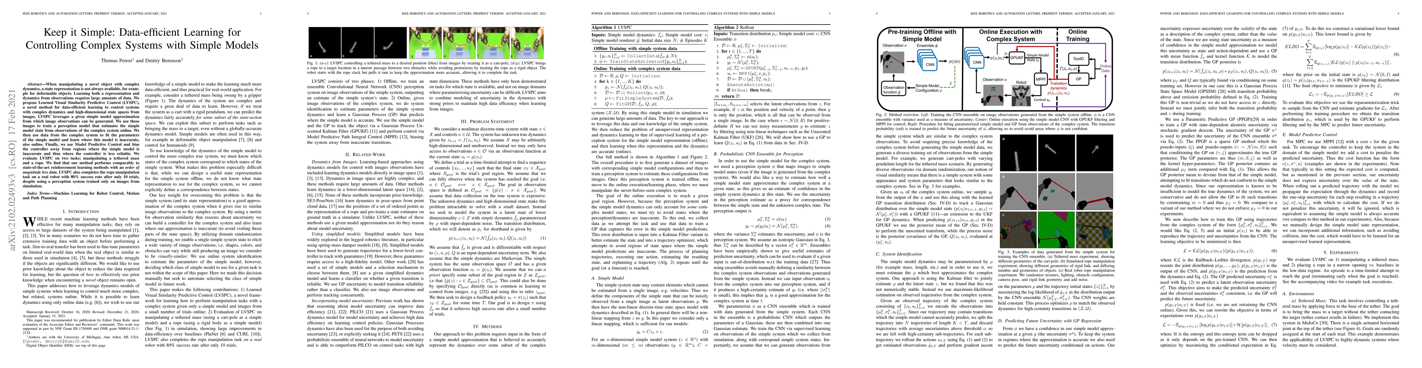 When manipulating a novel object with complex dynamics, a state representation is not always available, for example for deformable objects. Learning both a representation and dynamics from observations requires large amounts of data. We propose Learned Visual Similarity Predictive Control (LVSPC), a novel method for data-efficient learning to control systems with complex dynamics and high-dimensional state spaces from images. LVSPC leverages a given simple model approximation from which image observations can be generated. We use these images to train a perception model that estimates the simple model state from observations of the complex system online. We then use data from the complex system to fit the parameters of the simple model and learn where this model is inaccurate, also online. Finally, we use Model Predictive Control and bias the controller away from regions where the simple model is inaccurate and thus where the controller is less reliable. We evaluate LVSPC on two tasks; manipulating a tethered mass and a rope. We find that our method performs comparably to state-of-the-art reinforcement learning methods with an order of magnitude less data. LVSPC also completes the rope manipulation task on a real robot with 80% success rate after only 10 trials, despite using a perception system trained only on images from simulation.