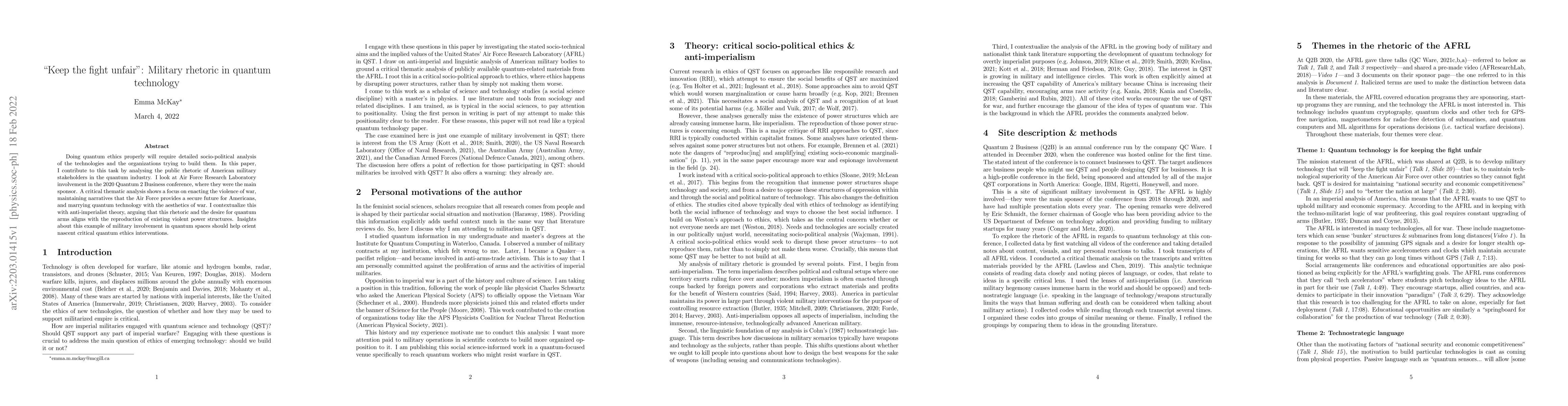 Doing quantum ethics properly will require detailed socio-political analysis of the technologies and the organizations trying to build them. In this paper, I contribute to this task by analysing the public rhetoric of American military stakeholders in the quantum industry. I look at Air Force Research Laboratory involvement in the 2020 Quantum 2 Business conference, where they were the main sponsor. A critical thematic analysis shows a focus on enacting the violence of war, maintaining narratives that the Air Force provides a secure future for Americans, and marrying quantum technology with the aesthetics of war. I contextualize this with anti-imperialist theory, arguing that this rhetoric and the desire for quantum arms aligns with the reproduction of existing violent power structures. Insights about this example of military involvement in quantum spaces should help orient nascent critical quantum ethics interventions.