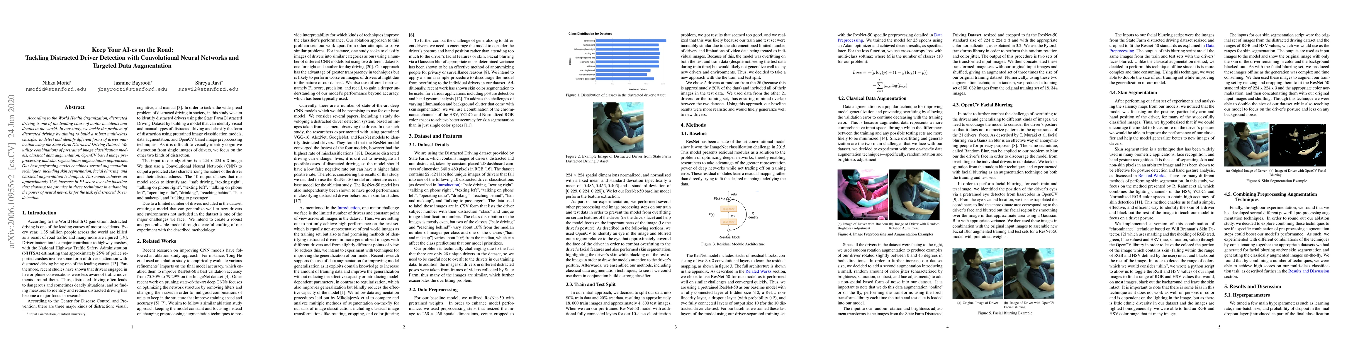 According to the World Health Organization, distracted driving is one of the leading cause of motor accidents and deaths in the world. In our study, we tackle the problem of distracted driving by aiming to build a robust multi-class classifier to detect and identify different forms of driver inattention using the State Farm Distracted Driving Dataset. We utilize combinations of pretrained image classification models, classical data augmentation, OpenCV based image preprocessing and skin segmentation augmentation approaches. Our best performing model combines several augmentation techniques, including skin segmentation, facial blurring, and classical augmentation techniques. This model achieves an approximately 15% increase in F1 score over the baseline, thus showing the promise in these techniques in enhancing the power of neural networks for the task of distracted driver detection.