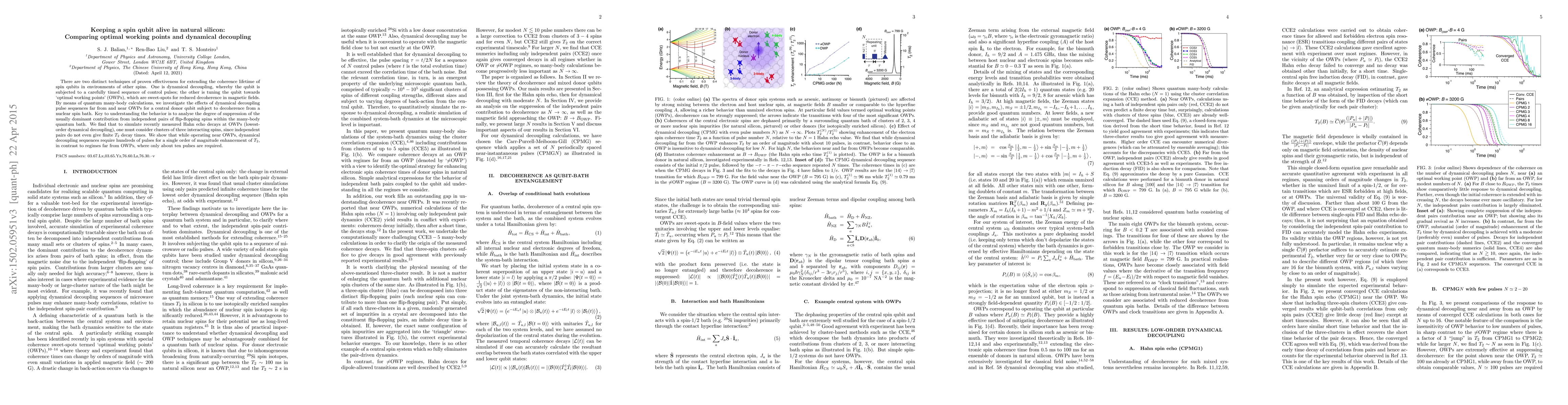 This paper compares two methods for enhancing the coherence of spin qubits in silicon: dynamical decoupling and optimal working points. Quantum calculations reveal that near optimal working points, hundreds of pulses are needed for significant coherence improvement, whereas fewer pulses suffice far from these points.