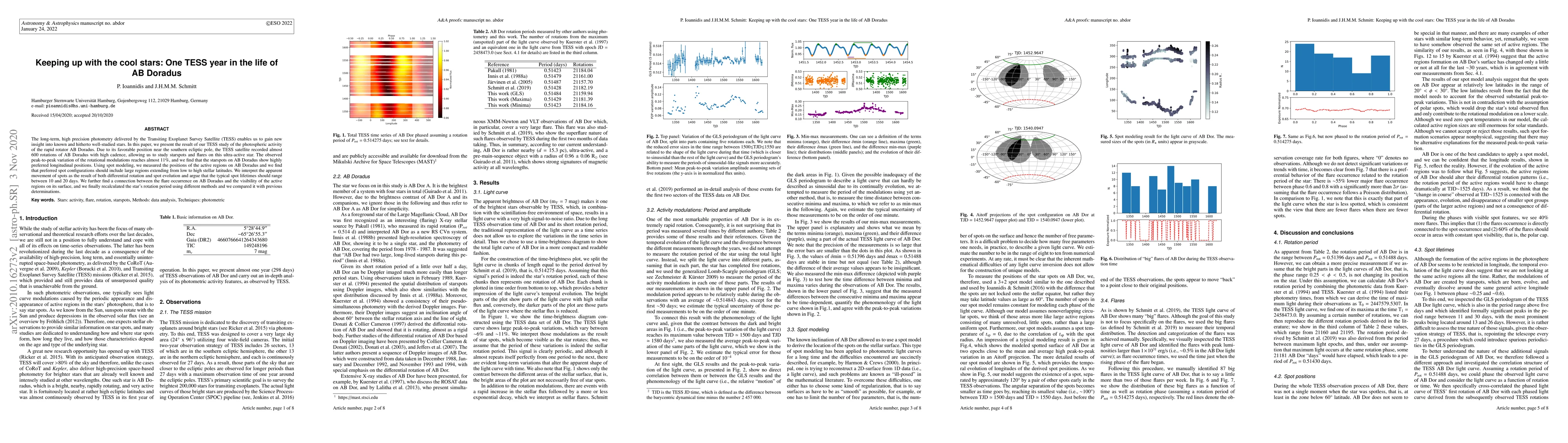 This study utilizes TESS data to analyze the photospheric activity of AB Doradus, revealing significant rotational modulations, preferred spot configurations, and a connection between flares and active regions. The research concludes that spot lifetimes range from 10 to 20 days and recalculates the star's rotation period.