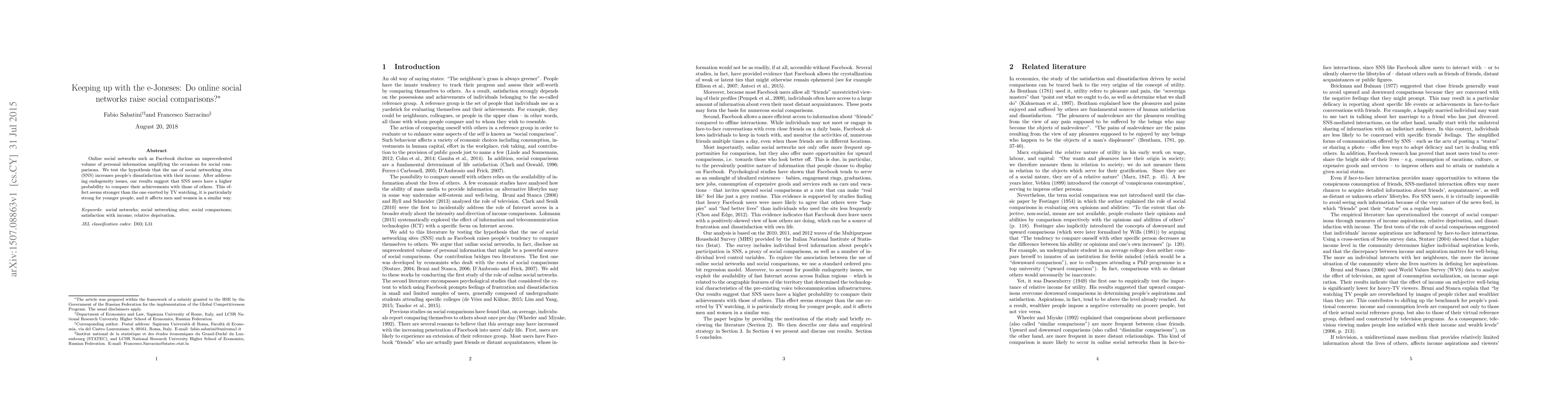 Title: Keeping up with the e-Joneses: Do online social networks raise social comparisons? Summary: Research shows that using social networking sites leads to increased social comparisons and dissatisfaction with income, especially among younger users, with effects comparable to, but stronger than, those from TV watching.