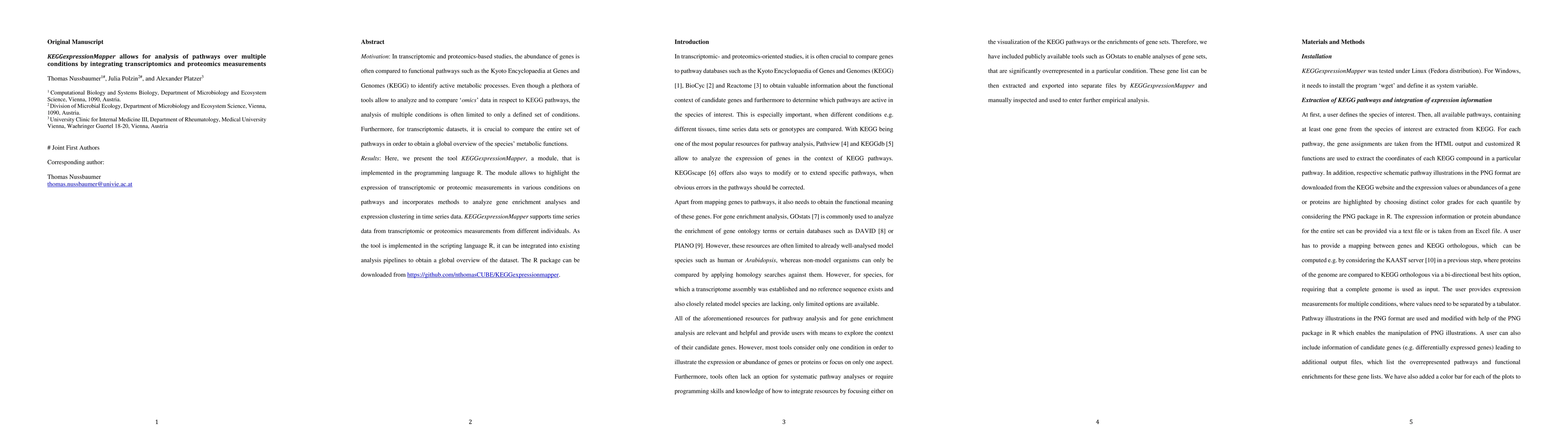 Motivation: In transcriptomic and proteomics-based studies, the abundance of genes is often compared to functional pathways such as the Kyoto Encyclopaedia at Genes and Genomes (KEGG) to identify active metabolic processes. Even though a plethora of tools allow to analyze and to compare omics data in respect to KEGG pathways, the analysis of multiple conditions is often limited to only a defined set of conditions. Furthermore, for transcriptomic datasets, it is crucial to compare the entire set of pathways in order to obtain a global overview of the species' metabolic functions. Results: Here, we present the tool KEGGexpressionMapper, a module, that is implemented in the programming language R. The module allows to highlight the expression of transcriptomic or proteomic measurements in various conditions on pathways and incorporates methods to analyze gene enrichment analyses and expression clustering in time series data. KEGGexpressionMapper supports time series data from transcriptomic or proteomics measurements from different individuals. As the tool is implemented in the scripting language R, it can be integrated into existing analysis pipelines to obtain a global overview of the dataset. The R package can be downloaded from https://github.com/nthomasCUBE/KEGGexpressionmapper.