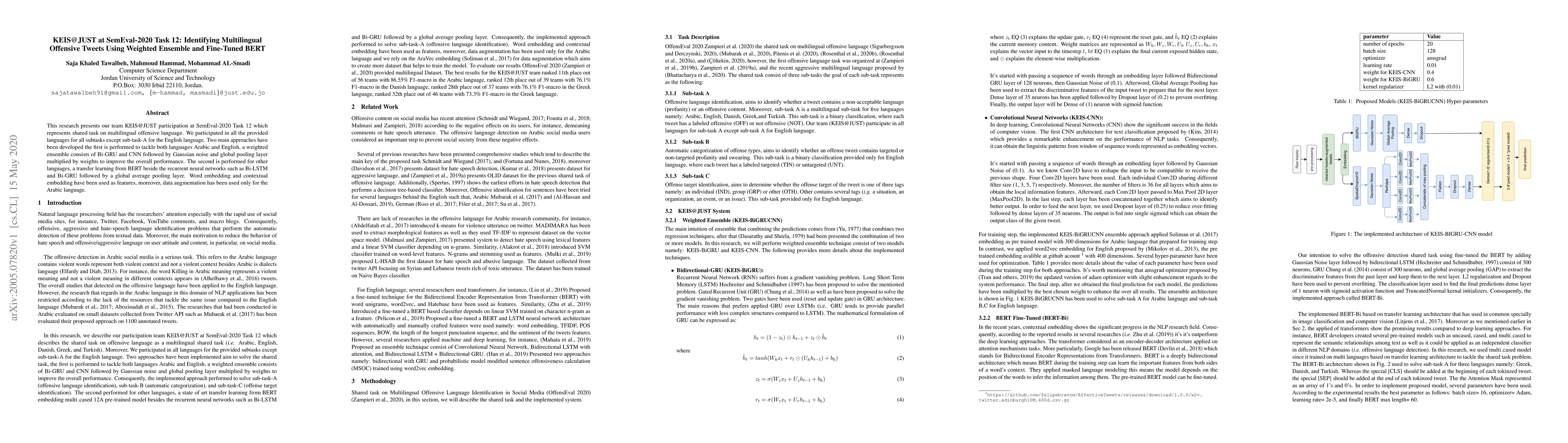 This research details KEIS@JUST's participation in SemEval-2020 Task 12, focusing on identifying multilingual offensive tweets. The team employed a weighted ensemble approach for Arabic and English, combining Bi-GRU and CNN with Gaussian noise and global pooling, while using fine-tuned BERT for other languages alongside Bi-LSTM and Bi-GRU with global average pooling.