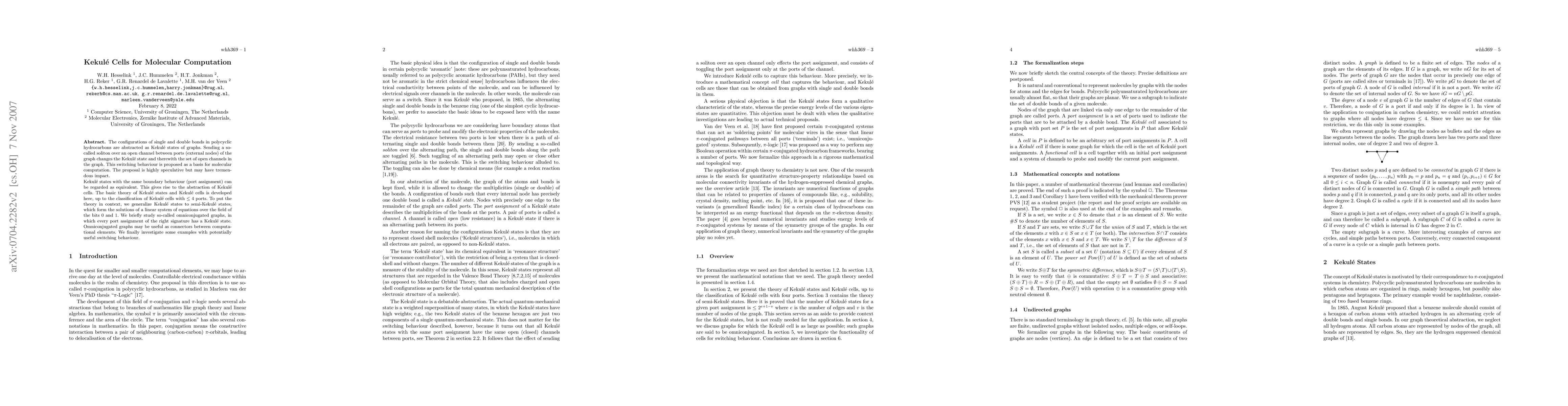 The configurations of single and double bonds in polycyclic hydrocarbons are abstracted as Kekul\'e states of graphs. Sending a so-called soliton over an open channel between ports (external nodes) of the graph changes the Kekul\'e state and therewith the set of open channels in the graph. This switching behaviour is proposed as a basis for molecular computation. The proposal is highly speculative but may have tremendous impact. Kekul\'e states with the same boundary behaviour (port assignment) can be regarded as equivalent. This gives rise to the abstraction of Kekul\'e cells. The basic theory of Kekul\'e states and Kekul\'e cells is developed here, up to the classification of Kekul\'e cells with $\leq 4$ ports. To put the theory in context, we generalize Kekul\'e states to semi-Kekul\'e states, which form the solutions of a linear system of equations over the field of the bits 0 and 1. We briefly study so-called omniconjugated graphs, in which every port assignment of the right signature has a Kekul\'e state. Omniconjugated graphs may be useful as connectors between computational elements. We finally investigate some examples with potentially useful switching behaviour.