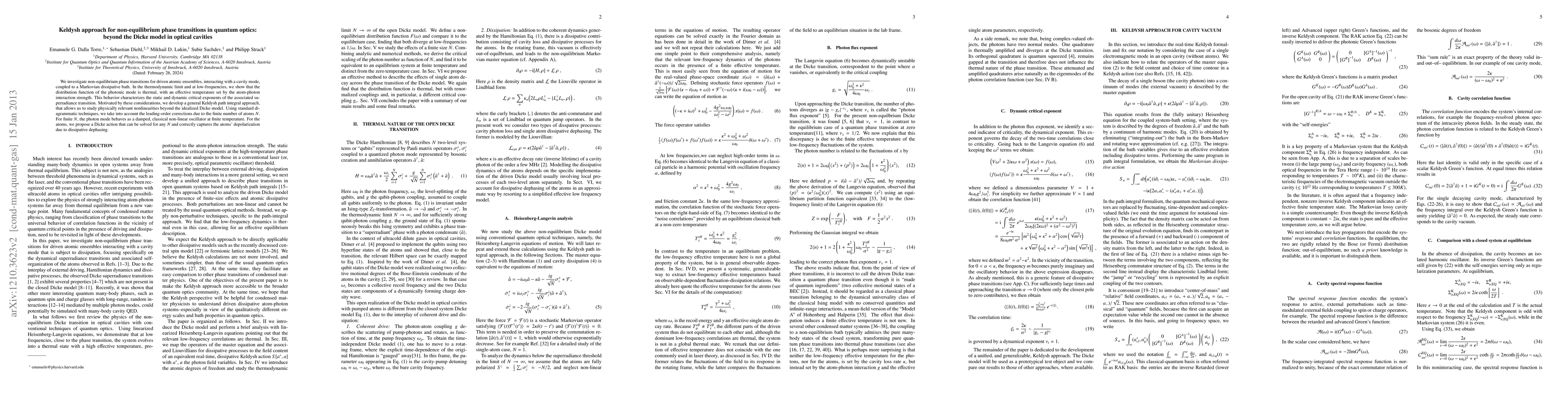 We investigate non-equilibrium phase transitions for driven atomic ensembles, interacting with a cavity mode, coupled to a Markovian dissipative bath. In the thermodynamic limit and at low-frequencies, we show that the distribution function of the photonic mode is thermal, with an effective temperature set by the atom-photon interaction strength. This behavior characterizes the static and dynamic critical exponents of the associated superradiance transition. Motivated by these considerations, we develop a general Keldysh path integral approach, that allows us to study physically relevant nonlinearities beyond the idealized Dicke model. Using standard diagrammatic techniques, we take into account the leading-order corrections due to the finite number of atoms N. For finite N, the photon mode behaves as a damped, classical non-linear oscillator at finite temperature. For the atoms, we propose a Dicke action that can be solved for any N and correctly captures the atoms' depolarization due to dissipative dephasing.