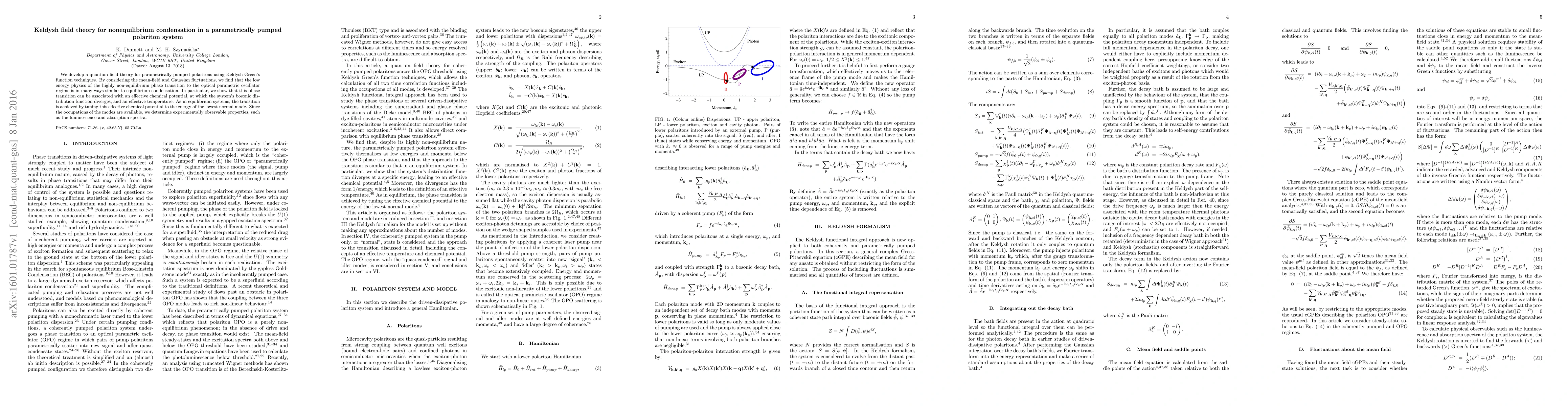 We develop a quantum field theory for parametrically pumped polaritons using Keldysh Green's function techniques. By considering the mean-field and Gaussian fluctuations, we find that the low energy physics of the highly non-equilibrium phase transition to the optical parametric oscillator regime is in many ways similar to equilibrium condensation. In particular, we show that this phase transition can be associated with an effective chemical potential, at which the system's bosonic distribution function diverges, and an effective temperature. As in equilibrium systems, the transition is achieved by tuning this effective chemical potential to the energy of the lowest normal mode. Since the occupations of the modes are available, we determine experimentally observable properties, such as the luminescence and absorption spectra.