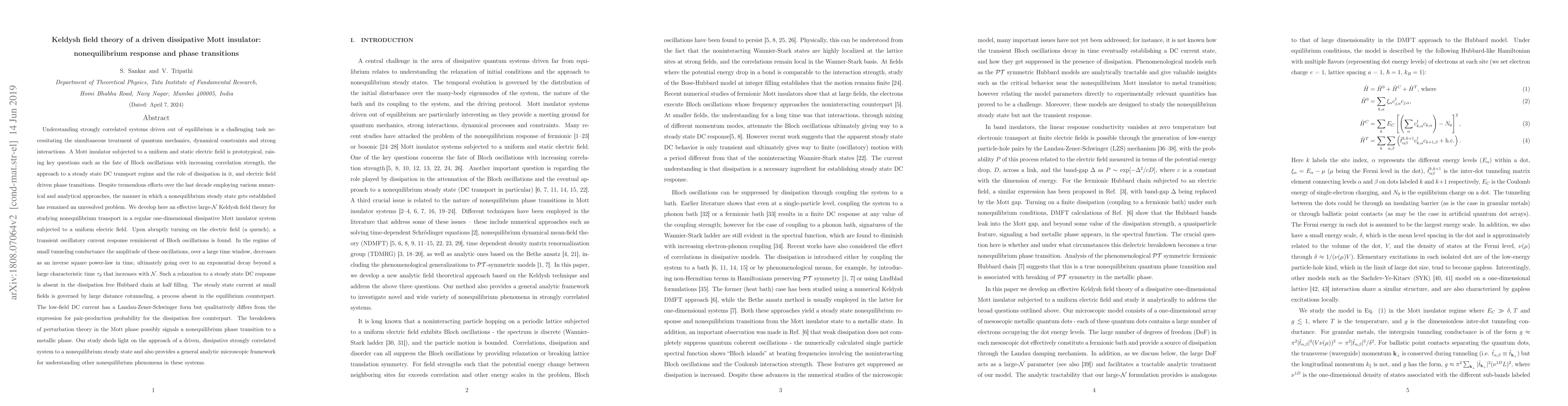 This paper develops a Keldysh field theory to study nonequilibrium transport in a driven dissipative one-dimensional Mott insulator under an electric field, revealing transient Bloch oscillations and a relaxation to steady-state DC transport governed by cotunneling. It suggests a possible nonequilibrium phase transition to a metallic phase due to breakdown of perturbation theory.