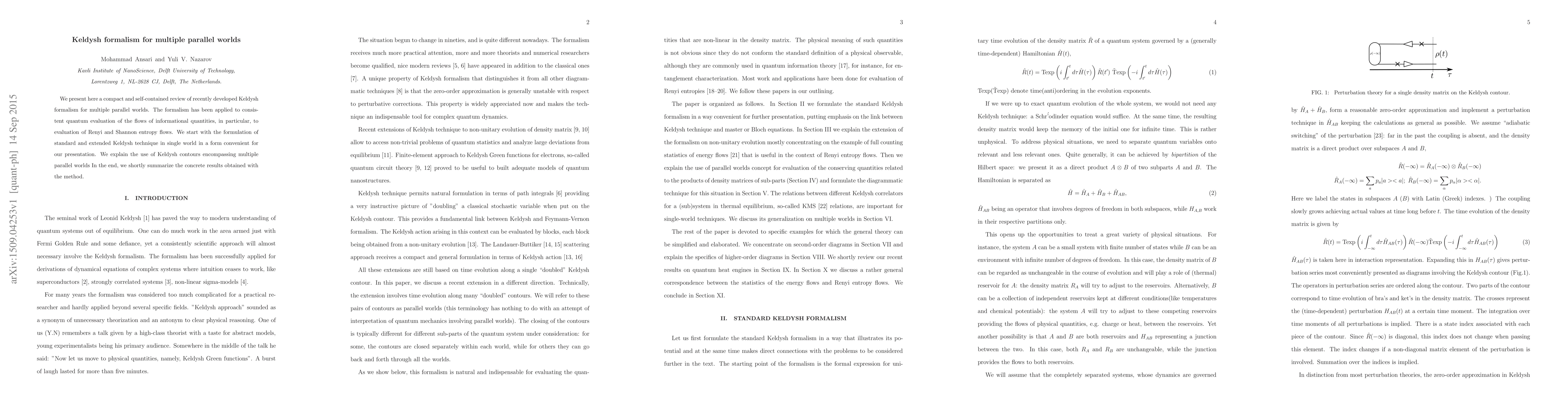 We present here a compact and self-contained review of recently developed Keldysh formalism for multiple parallel worlds. The formalism has been applied to consistent quantum evaluation of the flows of informational quantities, in particular, to evaluation of Renyi and Shannon entropy flows. We start with the formulation of standard and extended Keldysh technique in single world in a form convenient for our presentation. We explain the use of Keldysh contours encompassing multiple parallel worlds In the end, we shortly summarize the concrete results obtained with the method.
