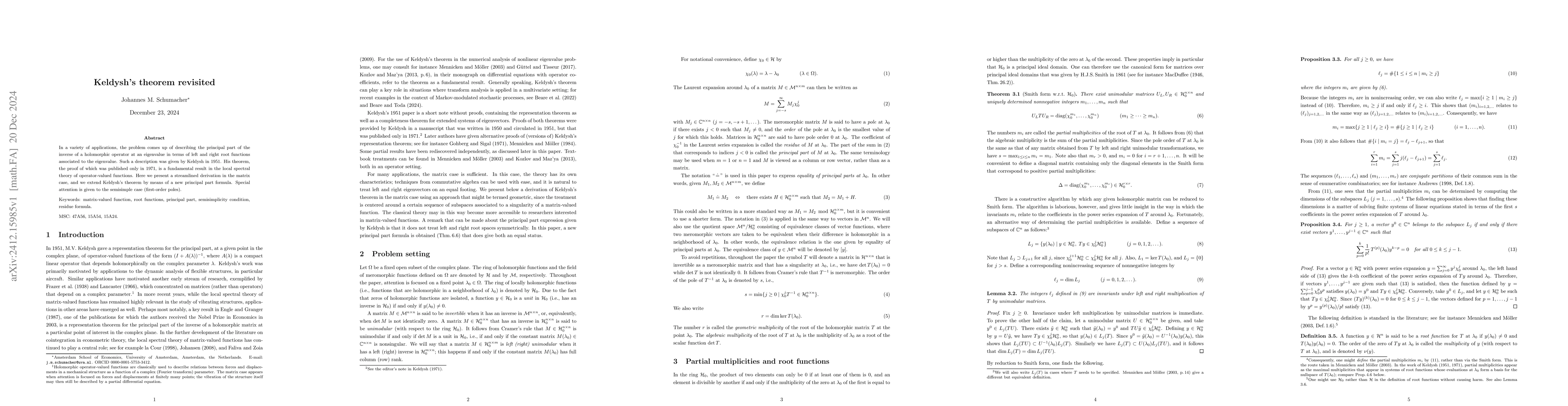 In a variety of applications, the problem comes up of describing the principal part of the inverse of a holomorphic operator at an eigenvalue in terms of left and right root functions associated to the eigenvalue. Such a description was given by Keldysh in 1951. His theorem, the proof of which was published only in 1971, is a fundamental result in the local spectral theory of operator-valued functions. Here we present a streamlined derivation in the matrix case, and we extend Keldysh's theorem by means of a new principal part formula. Special attention is given to the semisimple case (first-order poles).
