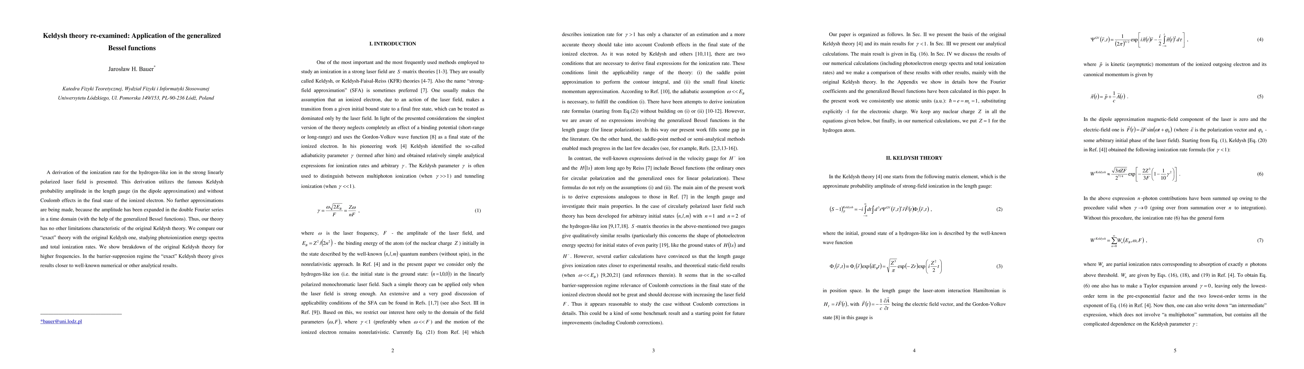 A derivation of the ionization rate for the hydrogen-like ion in the strong linearly polarized laser field is presented. This derivation utilizes the famous Keldysh probability amplitude in the length gauge (in the dipole approximation) and without Coulomb effects in the final state of the ionized electron. No further approximations are being made, because the amplitude has been expanded in the double Fourier series in a time domain (with the help of the generalized Bessel functions). Thus, our theory has no other limitations characteristic of the original Keldysh theory. We compare our "exact" theory with the original Keldysh one, studying photoionization energy spectra and total ionization rates. We show breakdown of the original Keldysh theory for higher frequencies. In the barrier-suppresion regime the "exact" Keldysh theory gives results closer to well-known numerical or other analytical results.