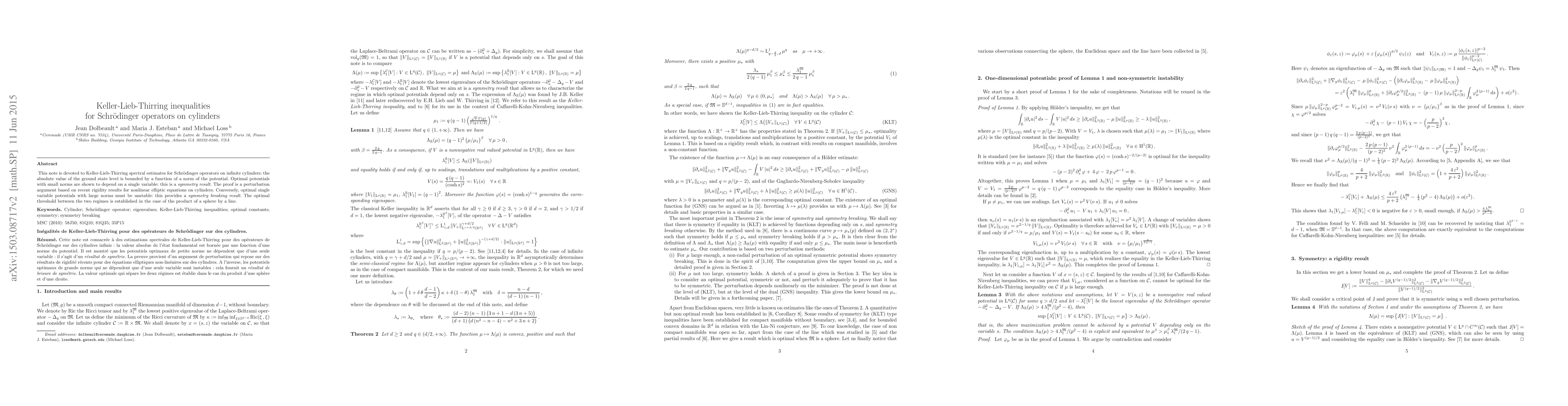 This note is devoted to Keller-Lieb-Thirring spectral estimates for Schr\"odinger operators on infinite cylinders: the absolute value of the ground state level is bounded by a function of a norm of the potential. Optimal potentials with small norms are shown to depend on a single variable. The proof is a perturbation argument based on recent rigidity results for nonlinear elliptic equations on cylinders. Conversely, optimal single variable potentials with large norms must be unstable. The optimal threshold between the two regimes is established in the case of the product of a sphere by a line.