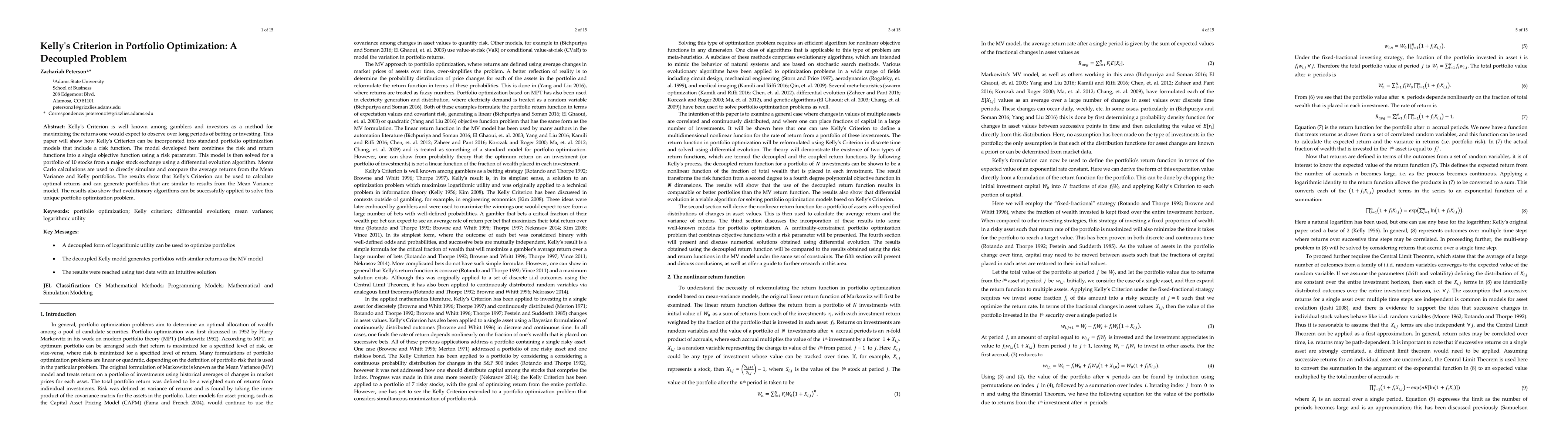 Kelly's Criterion is well known among gamblers and investors as a method for maximizing the returns one would expect to observe over long periods of betting or investing. These ideas are conspicuously absent from portfolio optimization problems in the financial and automation literature. This paper will show how Kelly's Criterion can be incorporated into standard portfolio optimization models. The model developed here combines risk and return into a single objective function by incorporating a risk parameter. This model is then solved for a portfolio of 10 stocks from a major stock exchange using a differential evolution algorithm. Monte Carlo calculations are used to verify the accuracy of the results obtained from differential evolution. The results show that evolutionary algorithms can be successfully applied to solve a portfolio optimization problem where returns are calculated by applying Kelly's Criterion to each of the assets in the portfolio.