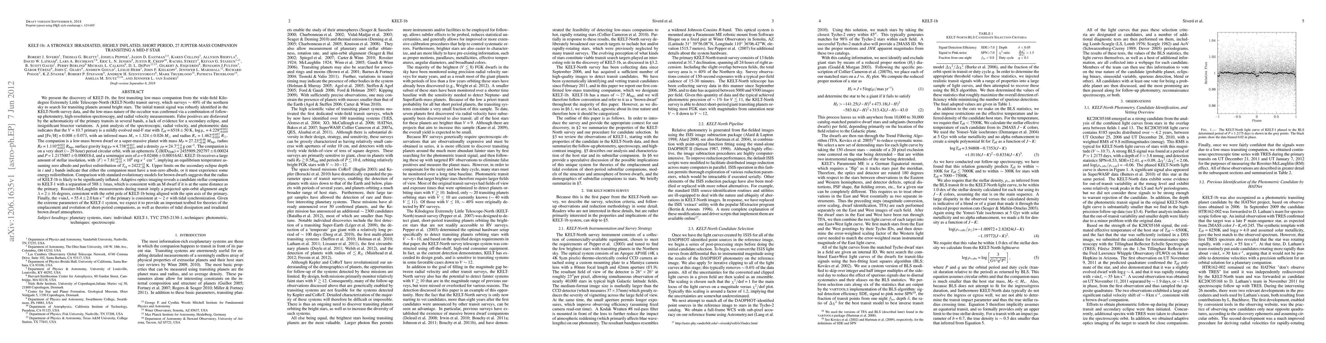KELT-1b is a highly inflated, short-period exoplanet transiting a mid-F star, discovered by the KELT-North survey, characterized by a significant radius and strong stellar irradiation, challenging current models of brown dwarf and planet evolution. The system's alignment and lack of stellar obliquity suggest tidal synchronization.