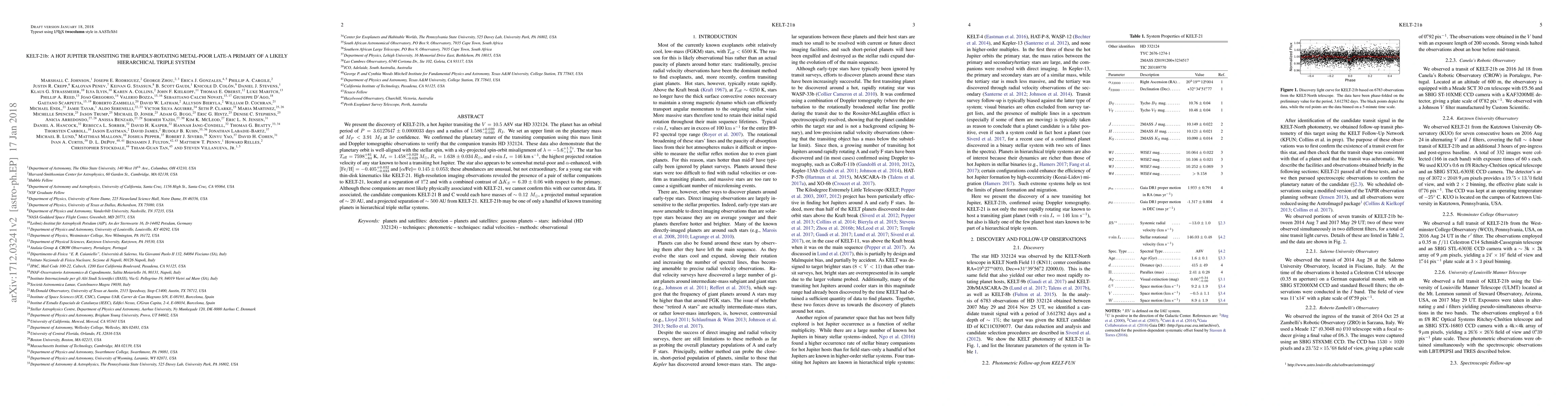 KELT-21b is a hot Jupiter transiting a rapidly rotating, metal-poor A8V star, with a high projected rotation velocity of 146 km/s. The star is part of a likely hierarchical triple system, with two stellar companions possibly associated.