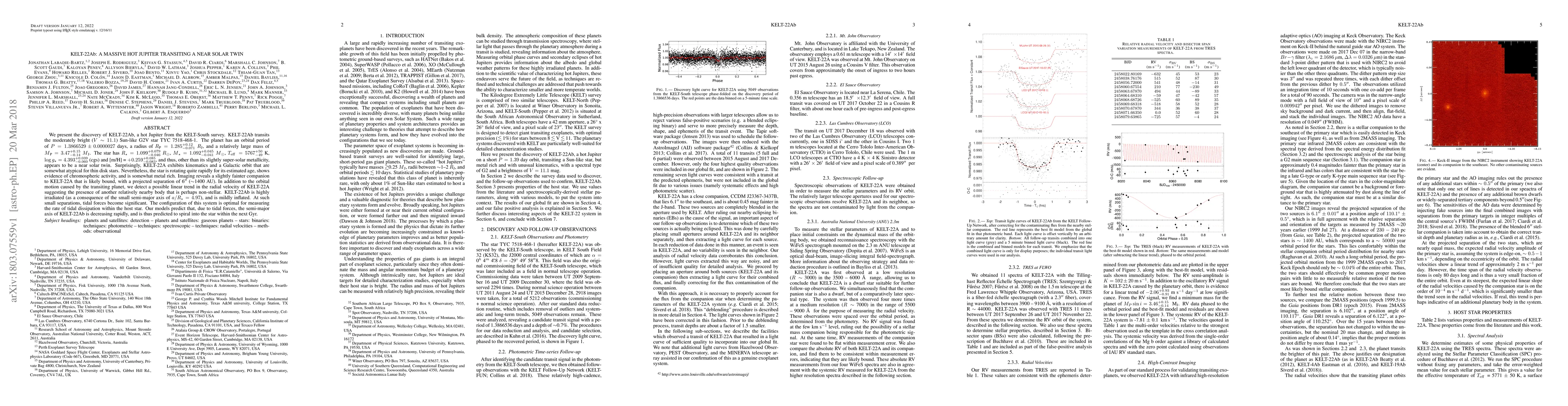 KELT-22Ab is a massive hot Jupiter transiting a near solar twin star, with a relatively large mass and radius. The host star, despite slightly super-solar metallicity, is a near solar twin, and the system's configuration is ideal for studying tidal dissipation and predicting the planet's eventual spiral into the star.