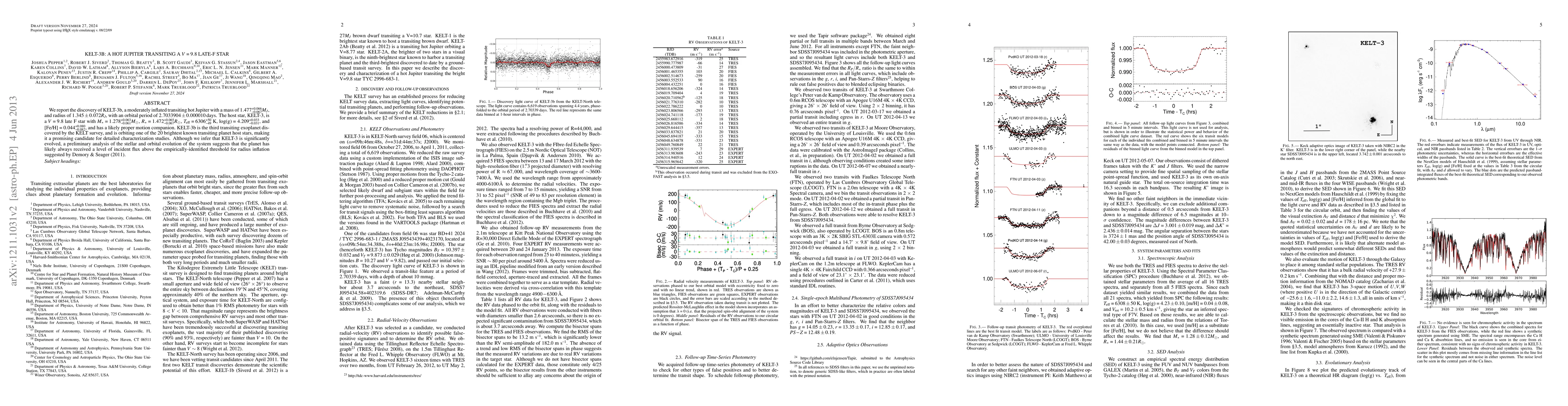 KELT-3b is a moderately inflated hot Jupiter transiting a V=9.8 late F star, discovered by the KELT survey, with a mass and radius of 1.477 M_J and 1.345 R_J respectively. The host star, KELT-3, is one of the 20 brightest known transiting planet host stars, indicating potential for detailed characterization studies.