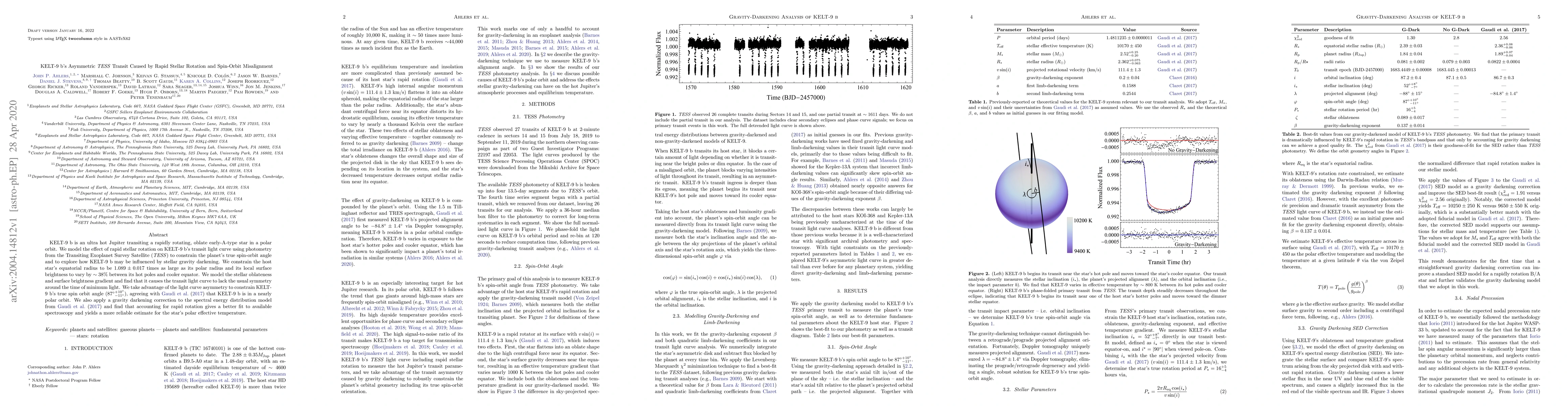 This paper models the asymmetric transit light curve of KELT-9 b due to its host star's rapid rotation and spin-orbit misalignment, revealing a nearly polar orbit for the planet. The study uses TESS data to constrain the star's oblateness and surface brightness gradient, which explains the transit light curve's asymmetry and provides a refined spin-orbit angle estimate.