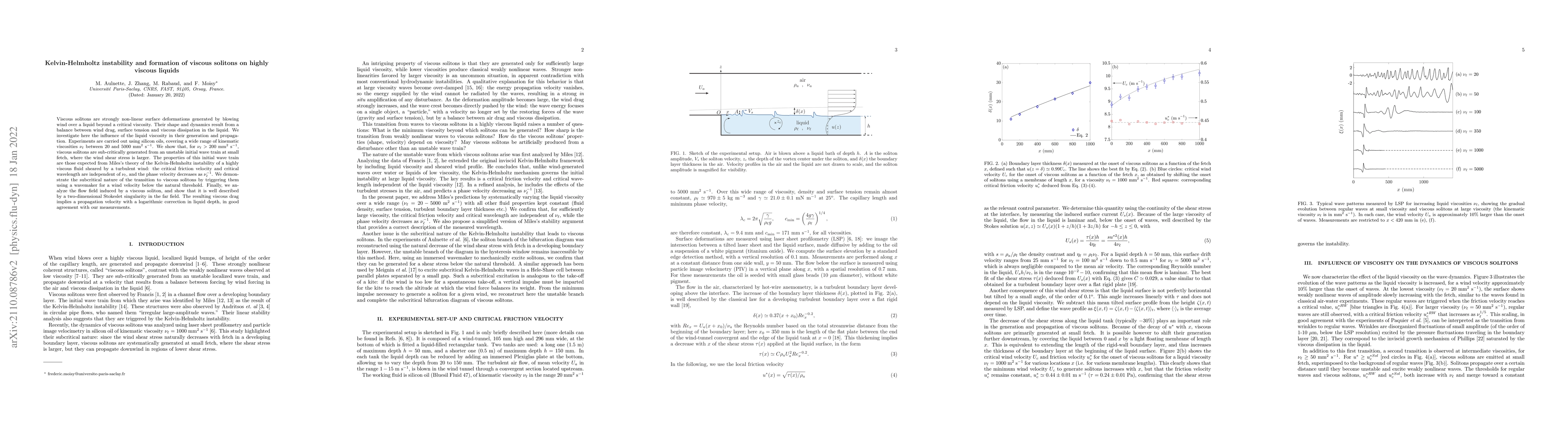 Viscous solitons are strongly non-linear surface deformations generated by blowing wind over a liquid beyond a critical viscosity. Their shape and dynamics result from a balance between wind drag, surface tension and viscous dissipation in the liquid. We investigate here the influence of the liquid viscosity in their generation and propagation. Experiments are carried out using silicon oils, covering a wide range of kinematic viscosities $\nu_\ell$ between 20 and 5000~mm$^2$~s$^{-1}$. \modif{We show that, for $\nu_\ell> 200$~mm$^2$~s$^{-1}$, viscous solitons are sub-critically generated from an unstable initial wave train at small fetch, where the wind shear stress is larger. The properties of this initial wave train are those expected from Miles's theory of the Kelvin-Helmholtz instability of a highly viscous fluid sheared by a turbulent wind: the critical friction velocity and critical wavelength are independent of $\nu_\ell$, and the phase velocity decreases as $\nu_\ell^{-1}$.} We demonstrate the subcritical nature of the transition to viscous solitons by triggering them using a wavemaker for a wind velocity below the natural threshold. Finally, we analyze the flow field induced by a viscous soliton, and show that it is well described by a two-dimensional Stokeslet singularity in the far field. The resulting viscous drag implies a propagation velocity with a logarithmic correction in liquid depth, in good agreement with our measurements.