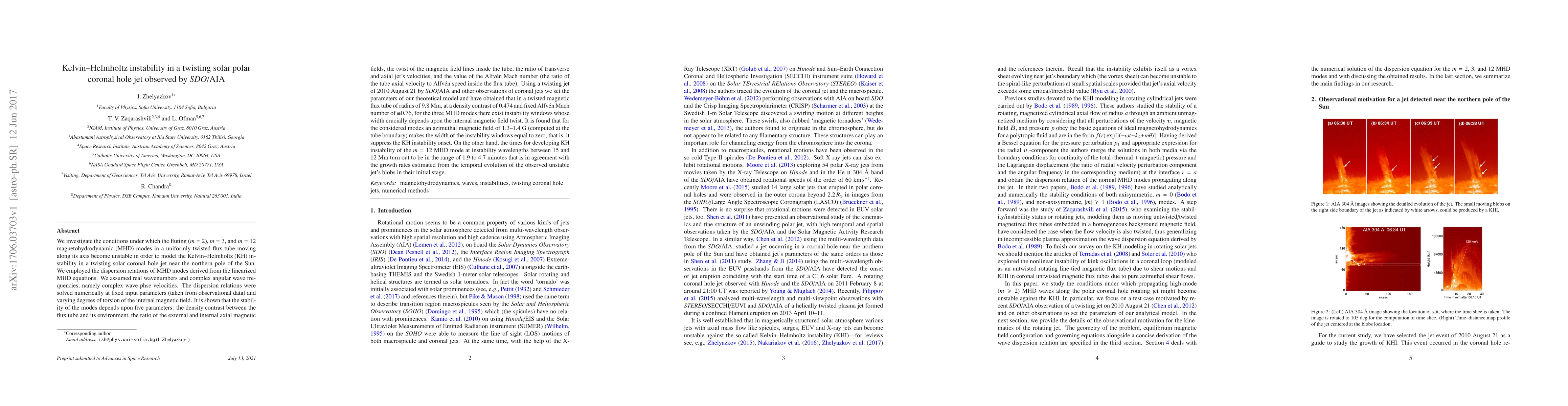We investigate the conditions under which the fluting ($m = 2$), $m = 3$, and $m = 12$ magnetohydrodynamic (MHD) modes in a uniformly twisted flux tube moving along its axis become unstable in order to model the Kelvin--Helmholtz (KH) instability in a twisting solar coronal hole jet near the northern pole of the Sun. Using a twisting jet of 2010 August 21 by \emph{SDO}/AIA and other observations of coronal jets we set the parameters of our theoretical model and have obtained that in a twisted magnetic flux tube of radius of $9.8$~Mm, at a density contrast of $0.474$ and fixed Alfv\'en Mach number of ${\cong}0.76$, for three MHD modes there exist instability windows whose width crucially depends upon the internal magnetic field twist. It is found that for the considered modes an azimuthal magnetic field of $1.3$--$1.4$~G (computed at the tube boundary) makes the width of the instability windows equal to zero, that is, it suppress the KH instability onset. On the other hand, the times for developing KH instability of the $m = 12$ MHD mode at instability wavelengths between $15$ and $12$~Mm turn out to be in the range of $1.9$ to $4.7$~minutes that is in agreement with the growth rates estimated from the temporal evolution of the observed unstable jet's blobs in their initial stage.