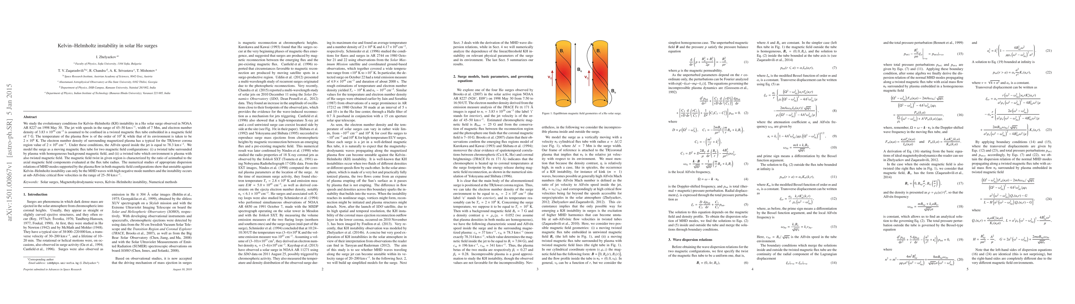 This research investigates the Kelvin-Helmholtz instability in a solar H-alpha surge observed in 1998, where a jet is studied in a twisted magnetic flux tube. Numerical studies show that the instability primarily affects MHD waves with high negative mode numbers, occurring at sub-Alfvenic flow velocities between 25-50 km/s.