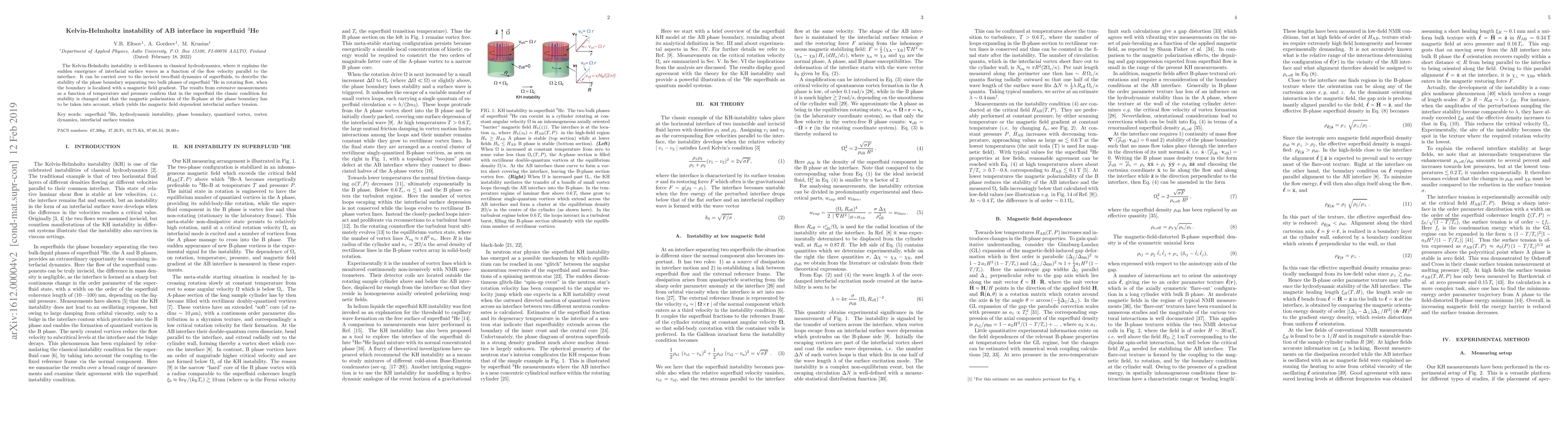 The Kelvin-Helmholtz instability is well-known in classical hydrodynamics, where it explains the sudden emergence of interfacial surface waves as a function of the velocity of flow parallel to the interface. It can be carried over to the inviscid two-fluid dynamics of superfluids, to study different types of interfaces and phase boundaries in quantum fluids. We report measurements on the stability of the phase boundary separating the two bulk phases of superfluid 3He in rotating flow, while the boundary is localized with the gradient of the magnetic field to a position perpendicular to the rotation axis. The results demonstrate that the classic stability condition, when modified for the superfluid environment, is obeyed down to 0.4 Tc, if a large fraction of the magnetic polarization of the B-phase is attributed to a parabolic reduction of the interfacial surface tension with increasing magnetic field.