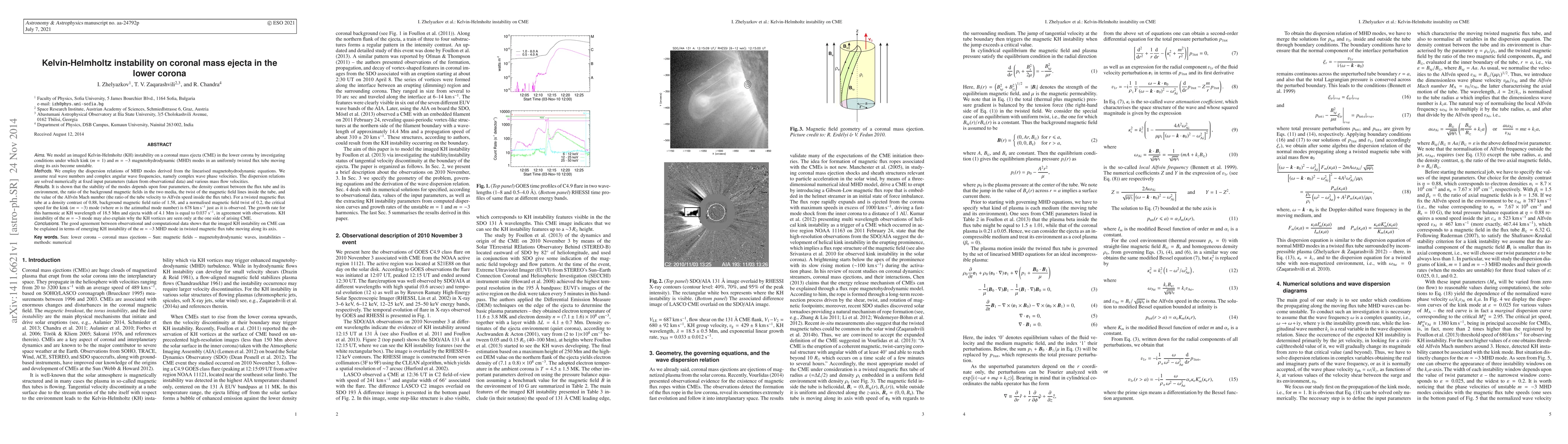 We model an imaged Kelvin-Helmholtz (KH) instability on a coronal mass ejecta (CME) in the lower corona by investigating conditions under which kink ($m = 1$) and $m = -3$ magnetohydrodynamic (MHD) modes in an uniformly twisted flux tube moving along its axis become unstable. We employ the dispersion relations of MHD modes derived from the linearised magnetohydrodynamic equations. We assume real wave numbers and complex angular wave frequencies, namely complex wave phase velocities. The dispersion relations are solved numerically at fixed input parameters (taken from observational data) and various mass flow velocities. It is shown that the stability of the modes depends upon four parameters, the density contrast between the flux tube and its environment, the ratio of the background magnetic fields in the two media, the twist of the magnetic field lines inside the tube, and the value of the Alfv\'en Mach number (the ratio of the tube velocity to Alfv\'en speed inside the flux tube). For a twisted magnetic flux tube at a density contrast of $0.88$, background magnetic field ratio of $1.58$, and a normalised magnetic field twist of $0.2$, the critical speed for the kink ($m = -3$) mode (where $m$ is the azimuthal mode number) is $678$ km\,s$^{-1}$ just as it is observed. The growth rate for this harmonic at KH wavelength of $18.5$ Mm and ejecta width of $4.1$ Mm is equal to $0.037$ s$^{-1}$, in agreement with observations. KH instability of the $m = -3$ mode may also explain why the KH vortices are seen only at the one side of arising CME. The good agreement between observational and computational data shows that the imaged KH instability on CME can be explained in terms of emerging KH instability of the $m = -3$ MHD mode in twisted magnetic flux tube moving along its axis.
